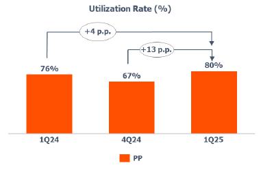 Average utilization rate of PP plants: higher compared to 4Q24 (+13 p.p.) mainly due to (i) normalization of operations at the European plants after unscheduled shutdowns in 4Q24; and (ii) adjustment of production in the United States to meet increased demand in the region.