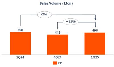 Compared to 1Q24, sales volume was lower (-2%) mainly explained by the lower PP sales volume in Europe due to the higher import volume in the region combined with weak demand.