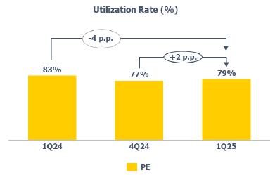 Compared to 1Q24, the utilization rate was higher (+4 p.p.) mainly due to the normalization of operations in the United States after the unscheduled shutdown that occurred in 1Q24.