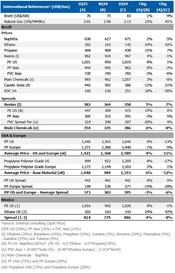 In Brazil, the PE spread was higher (+15%) compared to 4Q24, driven mainly by the increase in PE prices in the United States, resulting from the replenishment of inventories at the beginning of the year and scheduled shutdowns in the production of local gas-based crackers. The spread of the main chemicals was higher (+6%) compared to 4Q24 due to the appreciation in gasoline and propylene prices, influenced by greater demand and lower supply in the USA, also due to adverse weather conditions.