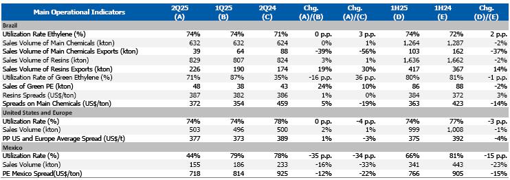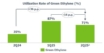 ² Due to the review of green ethylene production capacity, starting in 2Q25, the calculation of the utilization rate considers the production capacity of 275 thousand tons per year.
