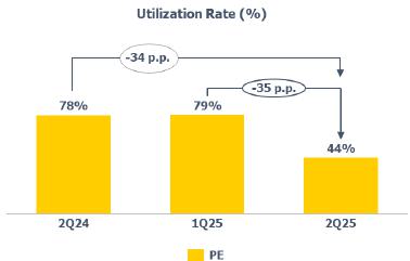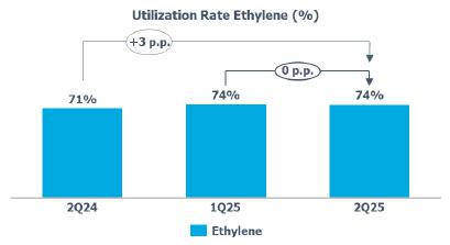Compared to 2Q24, the utilization rate was lower (-4 p.p.) mainly due to the lower supply of propylene in Europe in 2Q25.
