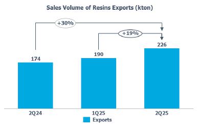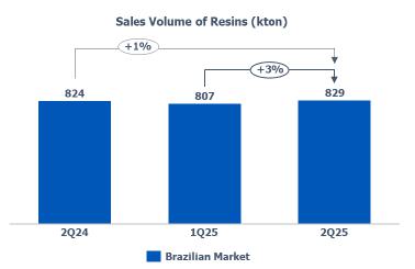Resin’s sales volume: in the Brazilian market, the increase (+3%) in relation to 1Q25 is mainly explained by the anticipation of purchases in the transformation chain due to (i) lower prices in the international market during 2Q25, impacted by the uncertainties around tariffs; and (ii) the expectation of an increase in international price references during the second half of 2025.
