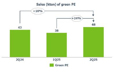 Green PE (I’m greenTM biobased) sales volume: increased compared to 1Q25 (+24%) mainly due to higher demand from new and existing customers.