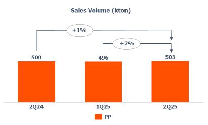 PP sales volume: increased compared to 1Q25 (+2%) mainly due to higher seasonal demand in the United States.