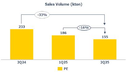 PE sales volume: lower compared to 1Q25 (-16%) and 2Q24 (-33%), mainly due to the lower availability of products for sale, explained by lower production, as mentioned above.