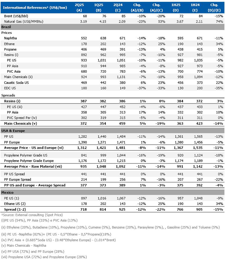 oThe price of naphtha decreased (-14%), as previously mentioned, offsetting the reduction in the price of the main chemicals (-7%) in relation to the previous quarter, mainly due to (i) the lower price of benzene (-17%), caused by scheduled and unscheduled shutdowns at styrene plants in the United States that occurred in the period; and (ii) the reduction in the price of propylene (-16%) in the USA, explained by the uncertainties around tariffs.