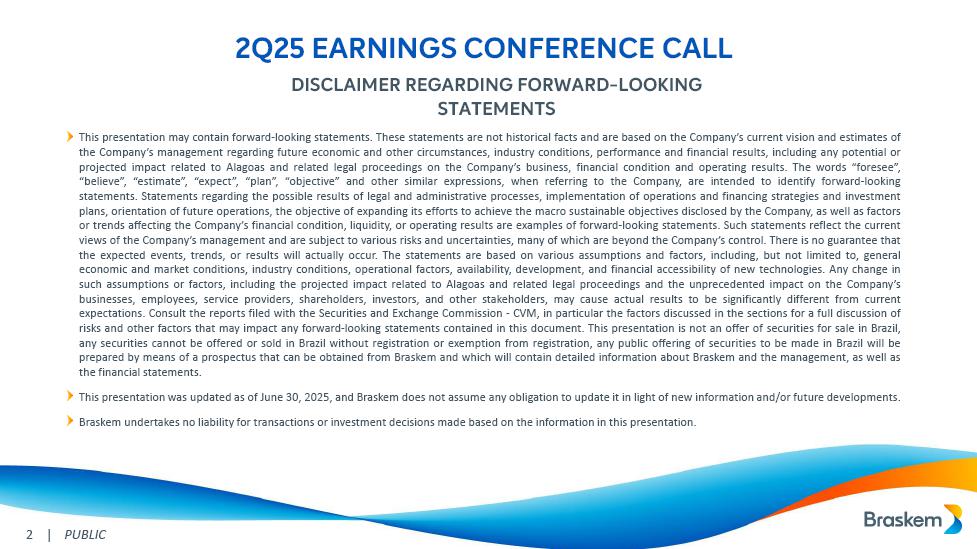 This report on Form 6-K may contain forward-looking statements within the meaning of the Private Securities Litigation Reform Act of 1995. These statements are statements that are not historical facts, and are based on our management’s current view and estimates of future economic and other circumstances, industry conditions, company performance and financial results, including any potential or projected impact of the geological event in Alagoas and related legal proceedings and of COVID-19 on our business, financial condition and operating results. The words “anticipates,” “believes,” “estimates,” “expects,” “plans” and similar expressions, as they relate to the company, are intended to identify forward-looking statements. Statements regarding the potential outcome of legal and administrative proceedings, the implementation of principal operating and financing strategies and capital expenditure plans, the direction of future operations and the factors or trends affecting our financial condition, liquidity or results of operations are examples of forward-looking statements. Such statements reflect the current views of our management and are subject to a number of risks and uncertainties, many of which are outside of the our control. There is no guarantee that the expected events, trends or results will actually occur. The statements are based on many assumptions and factors, including general economic and market conditions, industry conditions, and operating factors. Any changes in such assumptions or factors, including the projected impact of the geological event in Alagoas and related legal proceedings and the unprecedented impact of COVID-19 pandemic on our business, employees, service providers, stockholders, investors and other stakeholders, could cause actual results to differ materially from current expectations. Please refer to our annual report on Form 20-F for the year ended December 31, 2019 filed with the SEC, as well as any subsequent filings made by us pursuant to the Exchange Act, each of which is available on the SEC’s website (www.sec.gov), for a full discussion of the risks and other factors that may impact any forward-looking statements in this presentation.