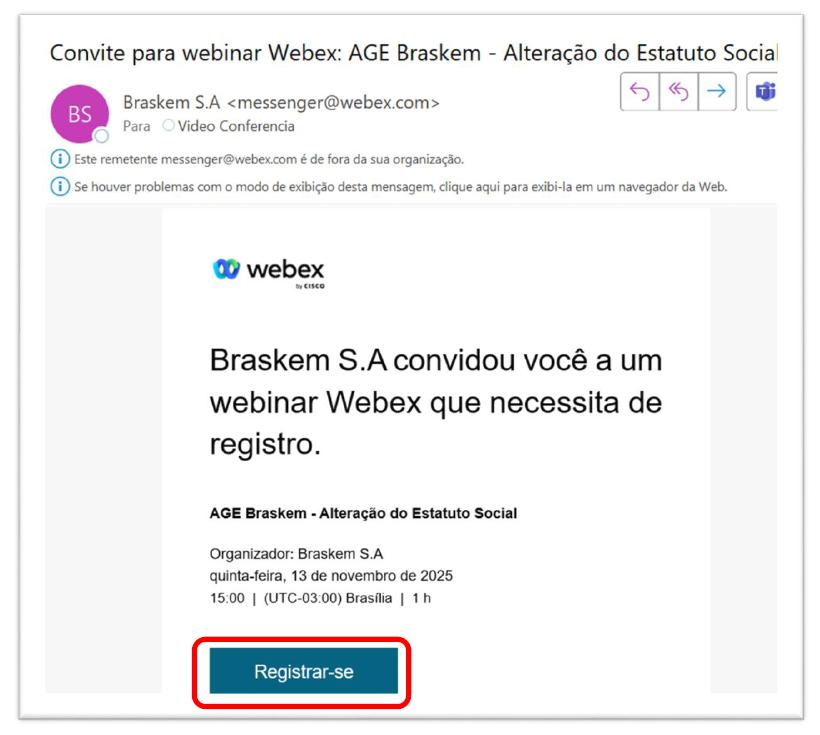 Step 1: You will receive an e-mail from the sender messenger@webex.com containing an invitation to access the Assembly. Clicking on the "Register" button will redirect you to the CISCO WEBEX website.