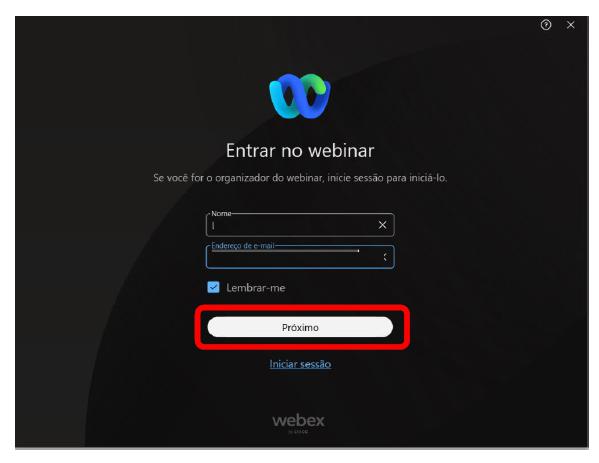 Step 8: When you click on "Start webinar" a new screen will open for you to enter your name and e-mail address, click on "Next”.