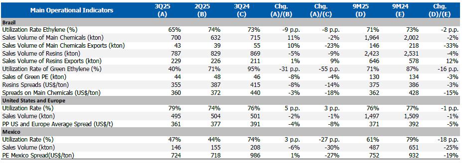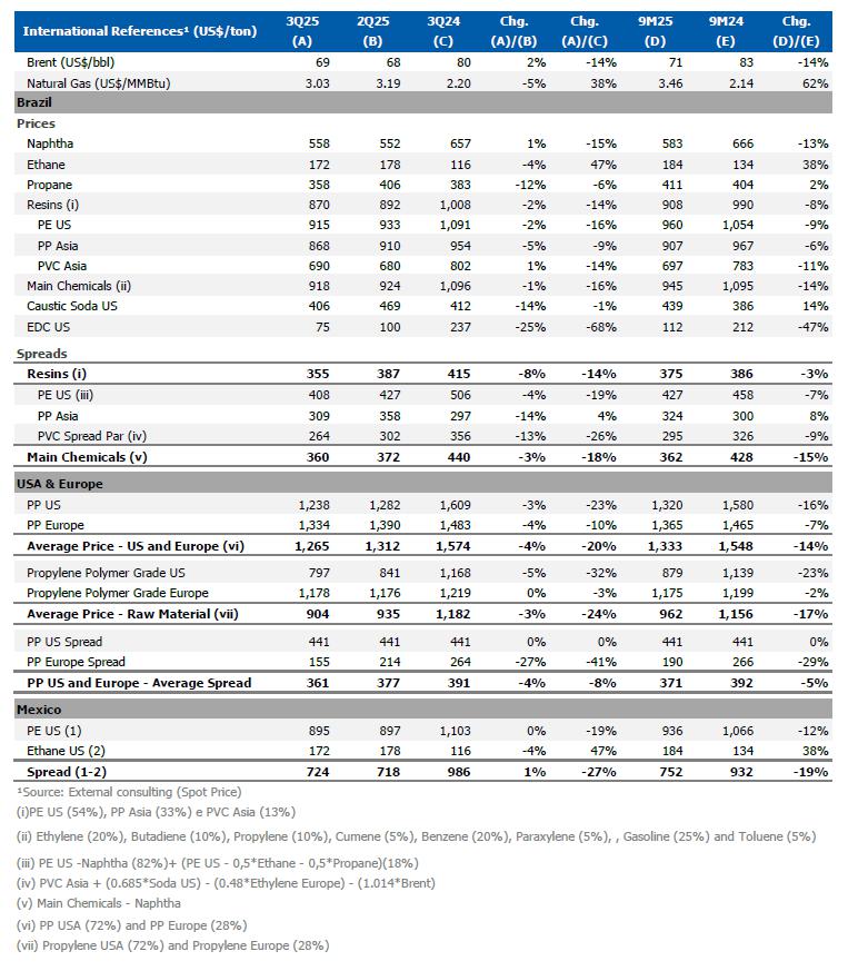 In the third quarter of 2025, despite global economy having adjusted to a scenario of new political measures and extremes of more moderate tariffs, the scenario remains volatile with few factors supporting the growth of economic activity for the second half of the year. In this context, chemical and petrochemical spreads in the international market continue under pressure, impacting results across all regions.