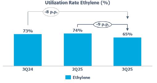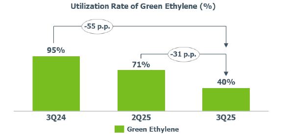 Average utilization rate of green ethylene: lower compared to 2Q25 (-31 p.p.) and 3Q24 (-55 p.p.) due to the optimization of Green PE inventory levels.