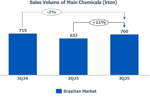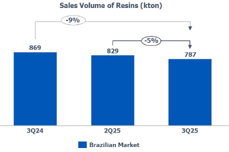 Resin’s sales volume: in the Brazilian market, the reduction (-5%) compared to 2Q25 is mainly explained by (i) lower PE sales volume due to the higher volume of imports in July and August; and (ii) lower PP sales volume due to lower demand in the Brazilian market by 5%.