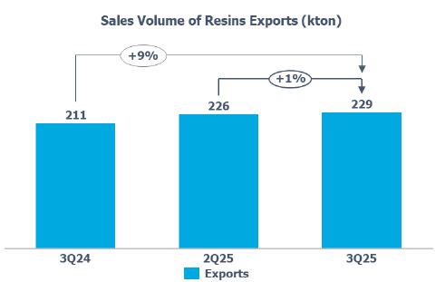 Resin exports remained in line with 2Q25 (+1%). In relation to 3Q24, the increase (+9%) is mainly explained by the (i) higher availability of product for export given the lower PP demand in the Brazilian market by 11%; and (ii) optimization of PE inventory levels.