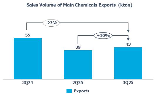 The increase in exports (+10%) compared to 2Q25 is mainly explained by the higher volume of propylene exports due to the increased availability of product for sale and lower demand for PP in the Brazilian market, partially offset by the lower volume of butadiene exports due to the prioritization of serving the Brazilian market.