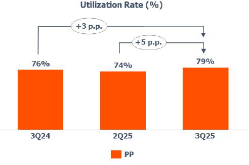 Compared to 3Q24, the utilization rate increased (+3 p.p.) mainly due to the optimization of inventories in the United States.