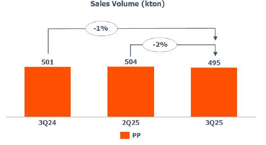 Compared to 3Q24, sales volume was lower (-1%) due to the lower volume of PP exported in the United States.