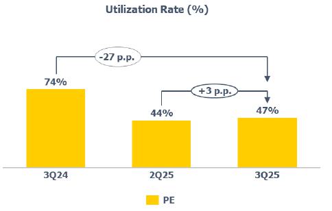 Average utilization rate of PE plants: higher compared to 2Q25 (+3 p.p.), mainly due to the normalization of operations at the Braskem Idesa petrochemical Complex after a scheduled shutdown concluded on July 31, 2025.