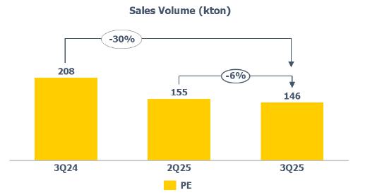 PE sales volume: lower (-6%) compared to 2Q25 and 3Q24 (-30%) mainly due to the lower availability of product for sale, as explained previously.