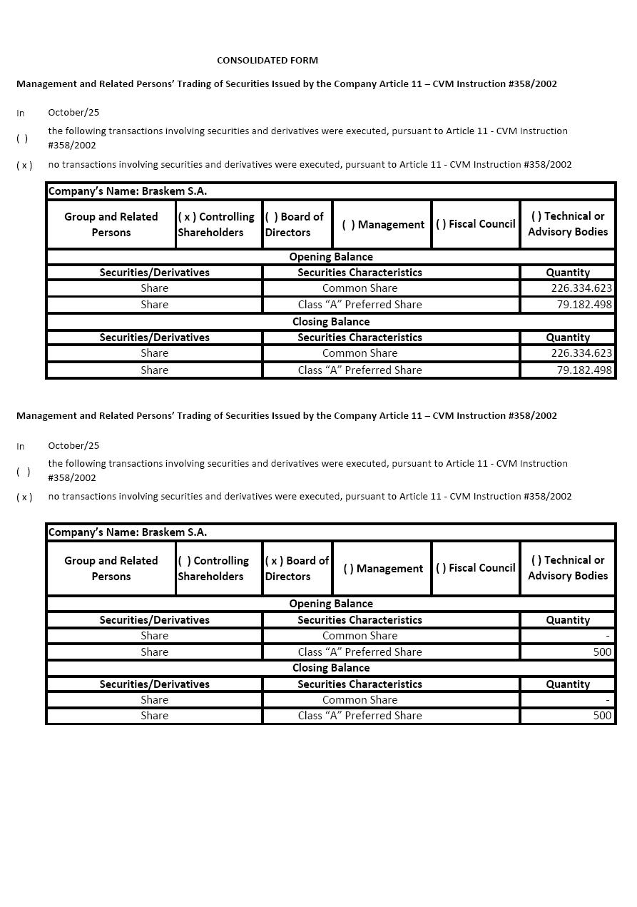 In October/25 ( ) ( x ) Group and Related Persons ( x ) Controlling Shareholders ( ) Board of Directors ( ) Management In October/25 ( ) ( x ) Group and Related Persons ( ) Controlling Shareholders ( x ) Board of Directors ( ) Management Securities/Derivatives Securities Characteristics Share Securities/Derivatives Securities Characteristics Share Class “A” Preferred Share Share Common Share Share Class “A” Preferred Share Securities Characteristics Securities/Derivatives Share Common Share ( ) Fiscal Council Common Share Share Class “A” Preferred Share Opening Balance 226.334.623 79.182.498 Quantity Management and Related Persons’ Trading of Securities Issued by the Company Article 11 – CVM Instruction #358/2002 79.182.498 Quantity Common Share Securities/Derivatives Securities Characteristics CONSOLIDATED FORM Share Share ( ) Fiscal Council Class “A” Preferred Share the following transactions involving securities and derivatives were executed, pursuant to Article 11 - CVM Instruction #358/2002 no transactions involving securities and derivatives were executed, pursuant to Article 11 - CVM Instruction #358/2002 ( ) Technical or Advisory Bodies Opening Balance Management and Related Persons’ Trading of Securities Issued by the Company Article 11 – CVM Instruction #358/2002 - 500 the following transactions involving securities and derivatives were executed, pursuant to Article 11 - CVM Instruction #358/2002 no transactions involving securities and derivatives were executed, pursuant to Article 11 - CVM Instruction #358/2002 Quantity - 500 Closing Balance Quantity Company’s Name: Braskem S.A. ( ) Technical or Advisory Bodies Closing Balance Company’s Name: Braskem S.A. 226.334.623 In October/25 ( ) ( x ) Group and Related Persons ( ) Controlling Shareholders ( ) Board of Directors (x ) Management 94.770 In October/25 ( ) ( x ) Group and Related Persons ( ) Controlling Shareholders ( ) Board of Directors ( ) Management Other American depositary receipt Securities/Derivatives Securities Characteristics Share Common Share Share Common Share Share Class “A” Preferred Share Share Class “A” Preferred Share Securities/Derivatives Securities Characteristics Closing Balance Quantity - 200 Other American depositary receipt 94.770 ( ) Technical or Advisory Bodies Company’s Name: Braskem S.A. Opening Balance Management and Related Persons’ Trading of Securities Issued by the Company Article 11 – CVM Instruction #358/2002 167.633 Closing Balance the following transactions involving securities and derivatives were executed, pursuant to Article 11 - CVM Instruction #358/2002 no transactions involving securities and derivatives were executed, pursuant to Article 11 - CVM Instruction #358/2002 Company’s Name: Braskem S.A. the following transactions involving securities and derivatives were executed, pursuant to Article 11 - CVM Instruction #358/2002 no transactions involving securities and derivatives were executed, pursuant to Article 11 - CVM Instruction #358/2002 Quantity - 167.633 Quantity - ( ) Fiscal Council Securities/Derivatives Securities Characteristics Share Common Share Share Common Share Share Class “A” Preferred Share Share Class “A” Preferred Share Securities/Derivatives ( ) Technical or Advisory Bodies Opening Balance Quantity - 200 Management and Related Persons’ Trading of Securities Issued by the Company Article 11 – CVM Instruction #358/2002 Securities Characteristics ( x ) Fiscal Council In October/25 ( ) ( x ) Group and Related Persons ( ) Controlling Shareholders ( ) Board of Directors ( ) Management - the following transactions involving securities and derivatives were executed, pursuant to Article 11 - CVM Instruction #358/2002 no transactions involving securities and derivatives were executed, pursuant to Article 11 - CVM Instruction #358/2002 Company’s Name: Braskem S.A. ( ) Fiscal Council ( x ) Technical or Advisory Bodies Management and Related Persons’ Trading of Securities Issued by the Company Article 11 – CVM Instruction #358/2002 Opening Balance Securities/Derivatives Securities Characteristics Quantity Share Common Share Share Common Share - Share Class “A” Preferred Share 5.300 Share Class “A” Preferred Share 5.300 Closing Balance Securities/Derivatives Securities Characteristics Quantity