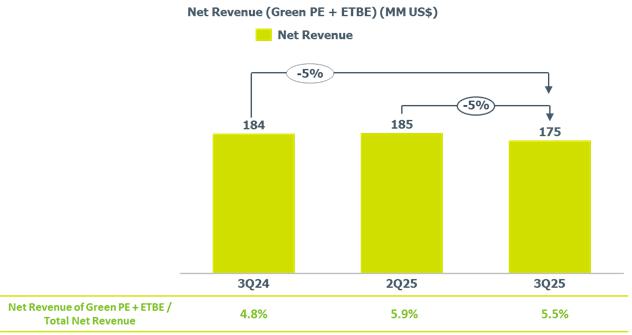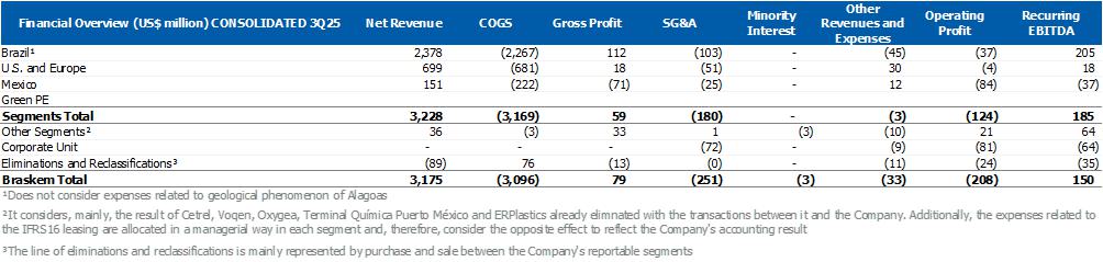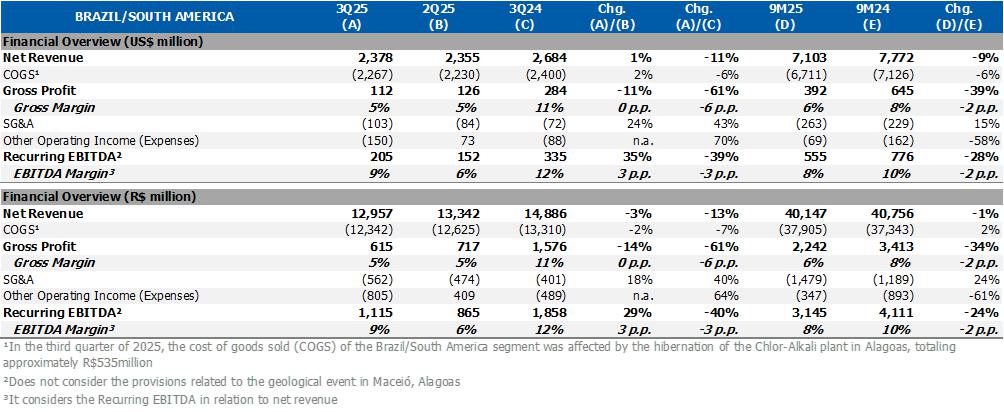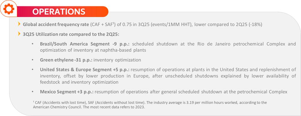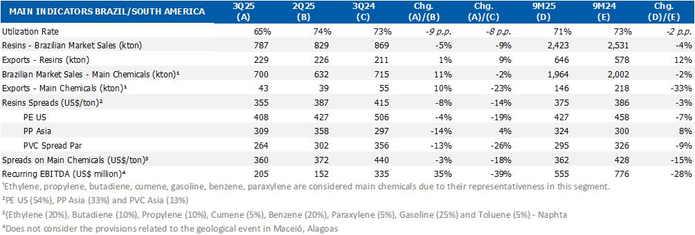 In the Brazil/South America segment, the average utilization rate of petrochemical plants was 65%, lower compared to 2Q25 due to the scheduled shutdown in Rio de Janeiro and the implementation of resilience initiatives related to inventory optimization. Resin sales in the Brazilian market were lower by 5%, while exports remained stable, as a result of the commercial strategy of prioritizing sales with higher added value and supplying the Brazilian market. On the other hand, sales of main chemicals grew 11% in the Brazilian market and 10% in exports. The segment's recurring EBITDA was US$205 million, an increase of 35% compared to the previous quarter.