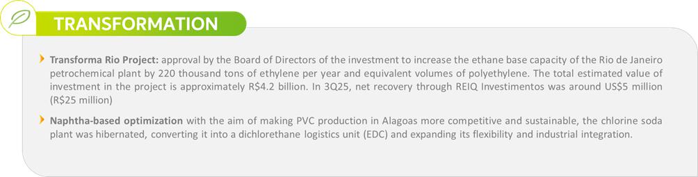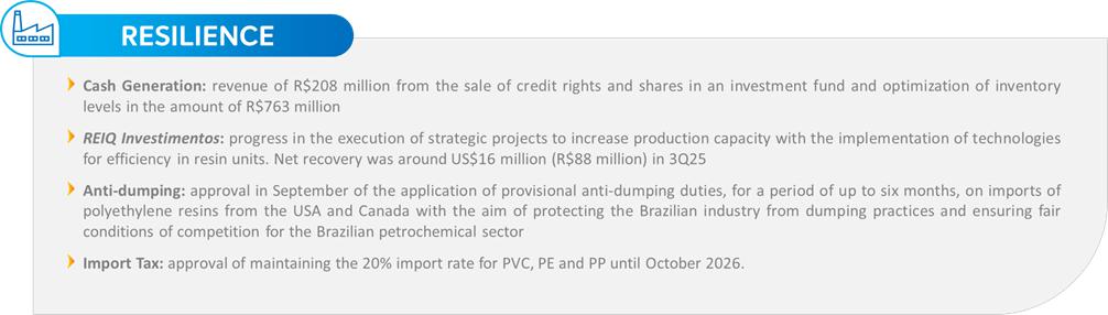 In this scenario, the Company remains committed to financial discipline and the execution of its Resilience and Transformation Program, which in the quarter highlights the following advances: (i) approval by the Chamber of Deputies of Bill 892/2025 (PRESIQ), which continues for deliberation in the Senate; (ii) approval of provisional anti-dumping duties on PE imports, a fundamental measure to re-establish equitable conditions of competition, protecting Brazilian production; and (iii) approval, by the Board of Directors, of the Transforma Rio Project, with an estimated investment of R$ 4.2 billion, to expand ethylene and polyethylene capacity in Rio de Janeiro, increasing the use of ethane in the feedstock profile.