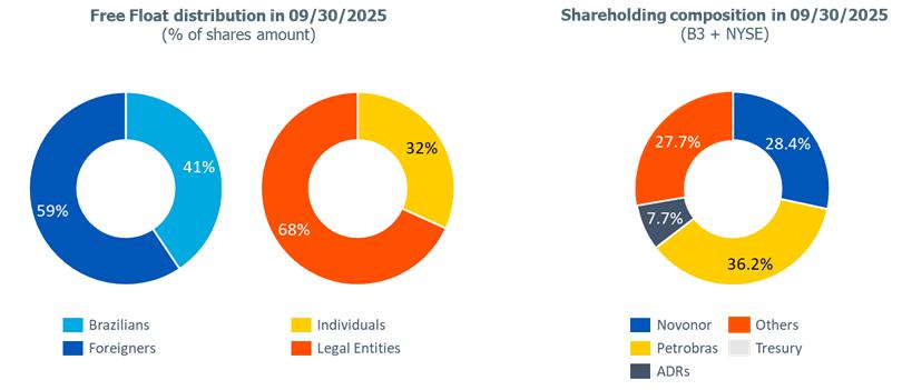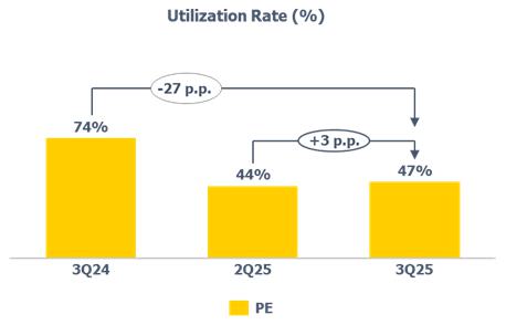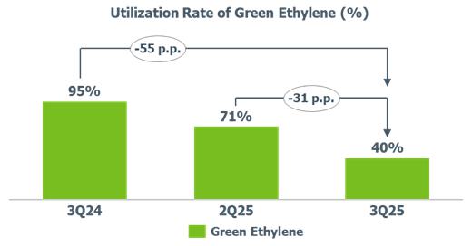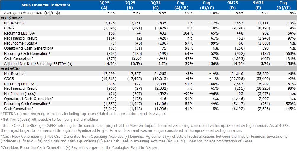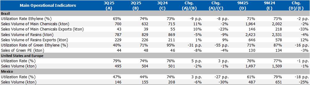 b) Average utilization rate of petrochemical complexes: lower compared to 2Q25 (-9 p.p.) and 3Q24 (-8 p.p.) mainly explained by (i) scheduled maintenance shutdown at the Rio de Janeiro petrochemical complex that began in August and lasted around 33 days; and (ii) strategy to optimize production at naphtha-based plants considering demand levels.