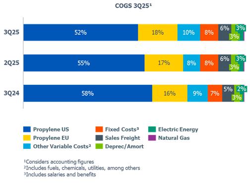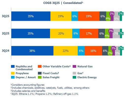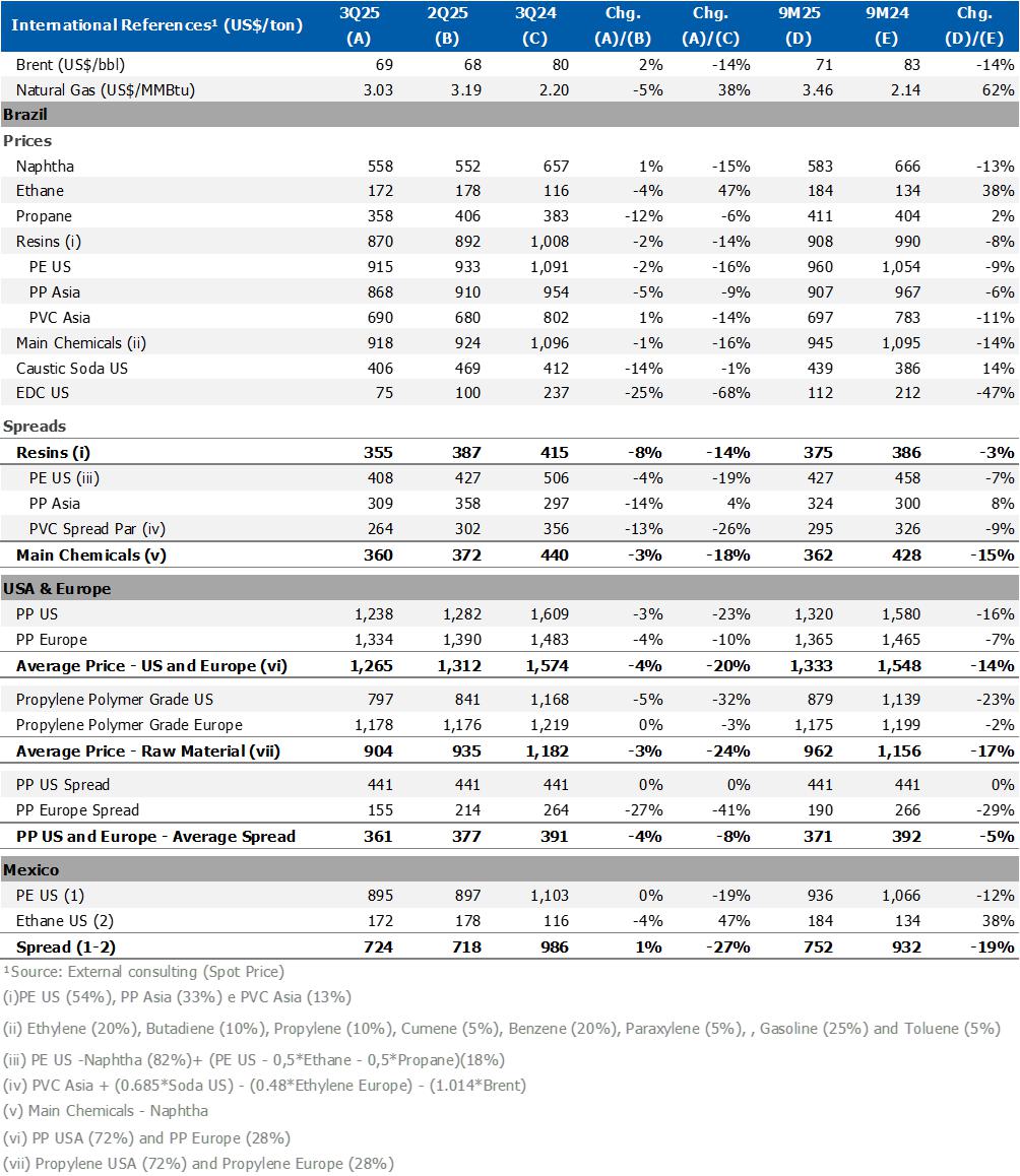 In the third quarter of 2025, the dynamics of the petrochemical industry continued to be influenced by the imbalance between global supply and demand, impacting price references in the international market. Compared to 2Q25, spreads in the international market were lower by (i) 4%, 14% and 13% in PE, PP and PVC, respectively, which are used as a reference in the Brazil/South America segment; and (ii) 4% in PP, which is used as a reference in the United States and Europe segment.