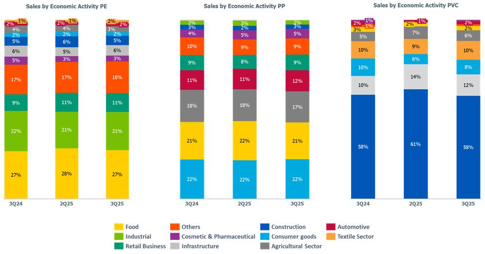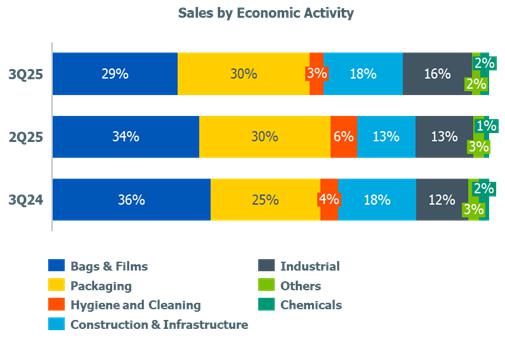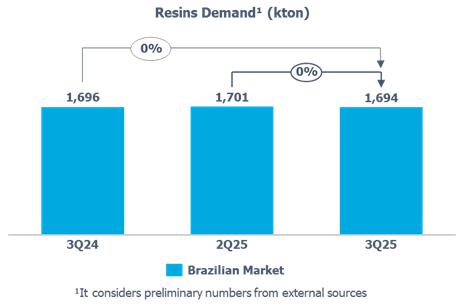 a) Demand for resins in Brazil (PE, PP, and PVC): remained in line when compared to 2Q25 and 3Q24, mainly explained by (i) higher demand for PE by 1%, with emphasis on the food and beverage sectors; and (ii) higher demand for PVC by 3%, influenced by the pipes and construction materials sectors. This effect was partially offset by the 5% lower demand for PP, mainly due to the higher levels of inventory of this product in the transformation chain.