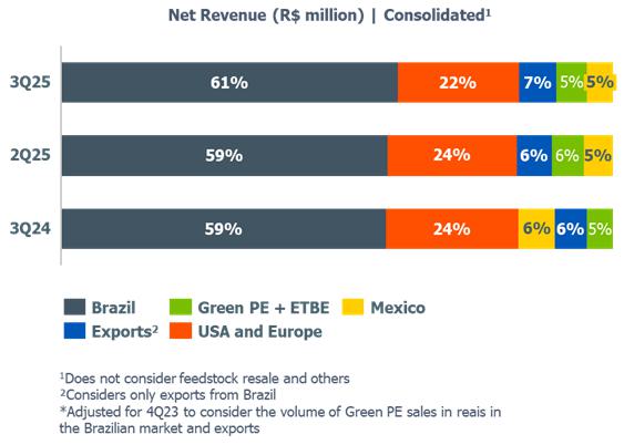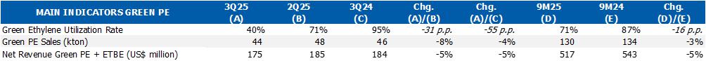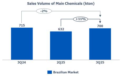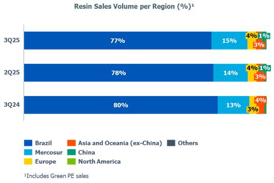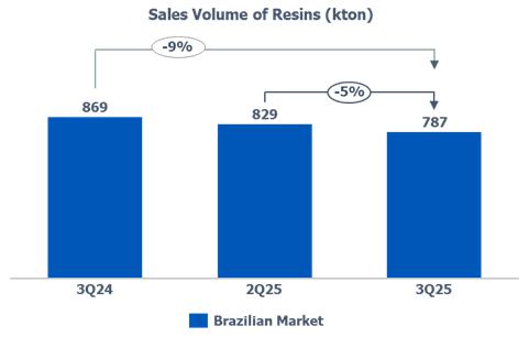 c) Resin sales volume: in the Brazilian market, the reduction (-5%) compared to 2Q25 is mainly explained by (i) lower PE sales volume due to the higher volume of imports in July and August; and (ii) lower PP sales volume due to lower demand in the Brazilian market by 5%.