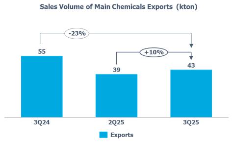 oCompared to 3Q24, the Main Chemicals spread was lower (-18%), influenced by the decrease in the prices of gasoline (-8%), benzene (-27%), butadiene (-32%), and propylene (-32%), partially offset by the reduction in the price of naphtha (-15%).
