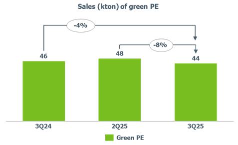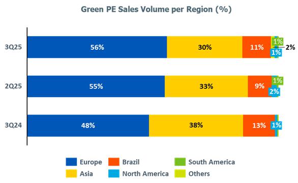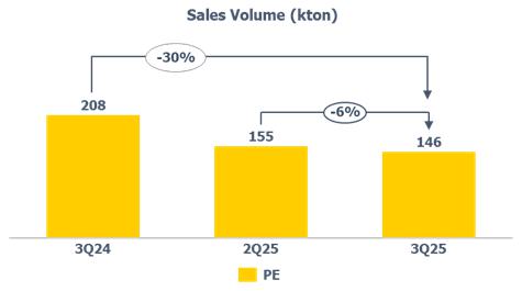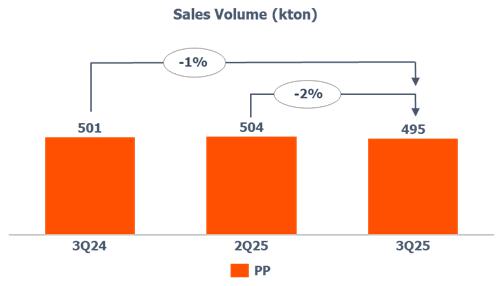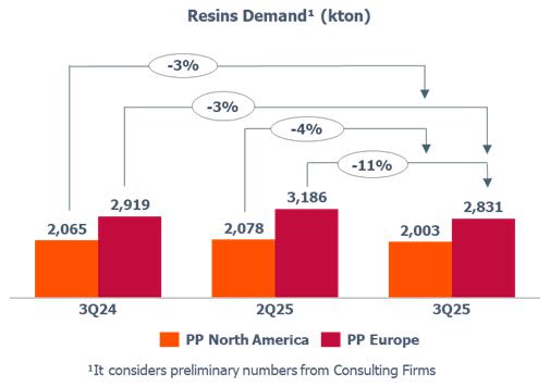 oThe PP price in Europe decreased (-4%) when compared to 2Q25, mainly due to lower demand from the household appliances, automotive and construction sectors, partially offset by the price of propylene, which remained in line compared to the previous quarter.