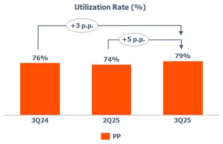 oThe PP price decreased (-3%) compared to 2Q25 due to the lower price of propylene in the USA (-5%), mainly explained by (i) the higher supply, due to the normalization of utilization rates in the region; and (ii) higher inventory levels in the production chain, mainly explained by the reduction in exports in the period.