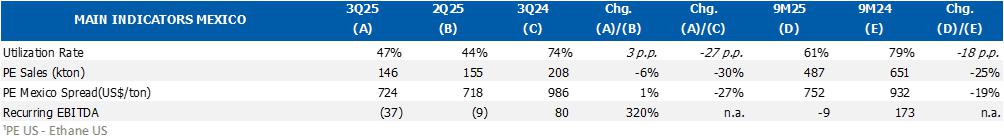 In Mexico, the utilization rate was impacted by the first general maintenance shutdown at the petrochemical Complex, which involved more than 3,000 people during its execution, and was concluded on July 31st. In this regard, PE sales in the quarter were lower by 6% and the costs of products sold were higher due to the lower supply of ethane by PEMEX and higher import costs.