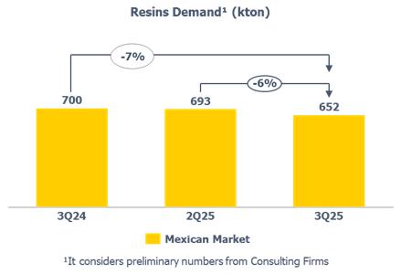 Resin exports remained in line with 2Q25 (+1%). In relation to 3Q24, the increase (+9%) is mainly explained by the (i) higher availability of product for export given the lower PP demand in the Brazilian market by 11%; and (ii) optimization of PE inventory levels.