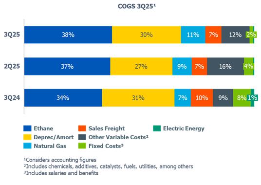 oThe price of ethane decreased (-4%) compared to 2Q25, mainly explained by the increase in supply, mainly due to the lower number of plant shutdowns in the region, added to market uncertainties regarding tariffs.