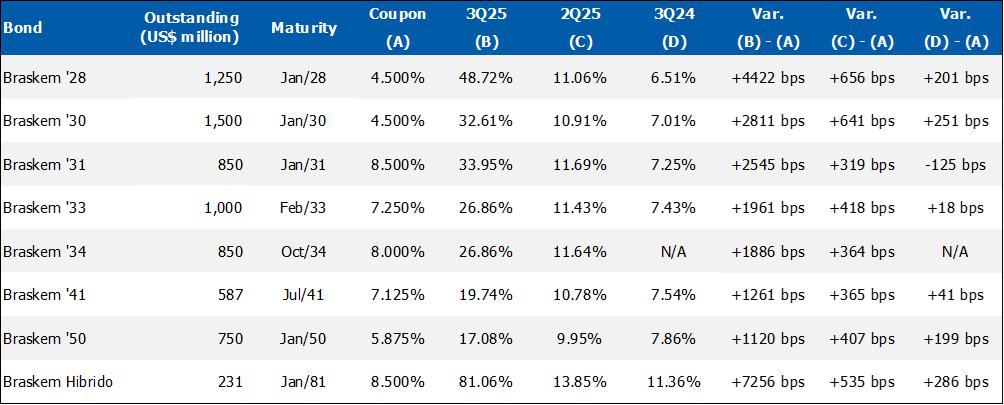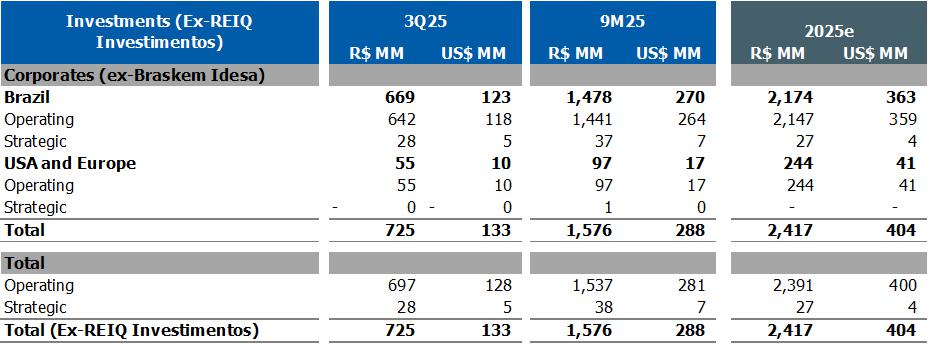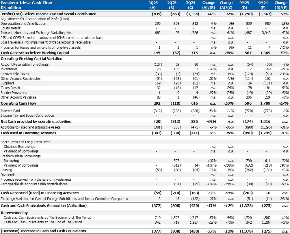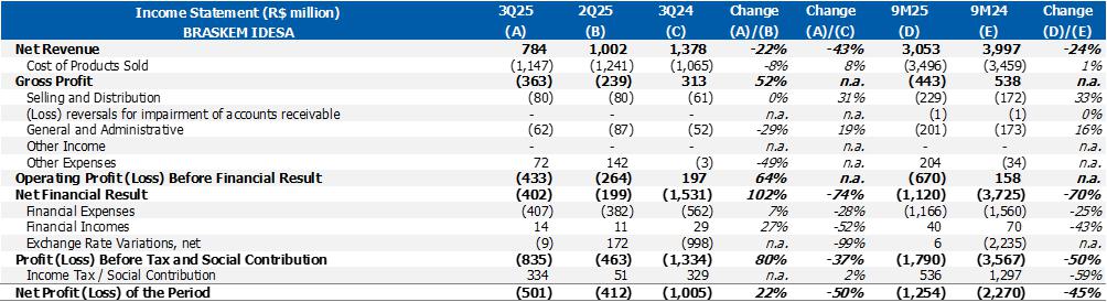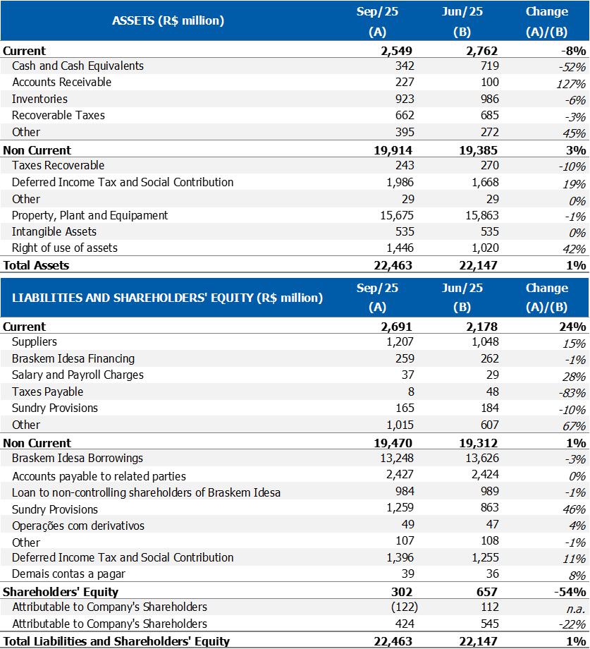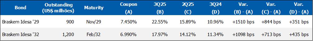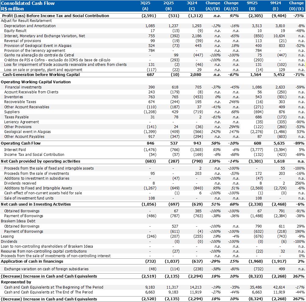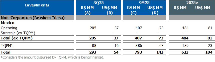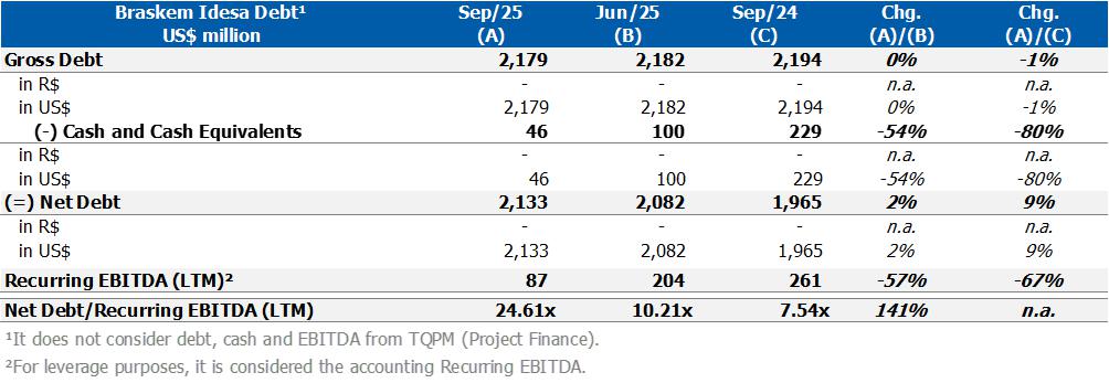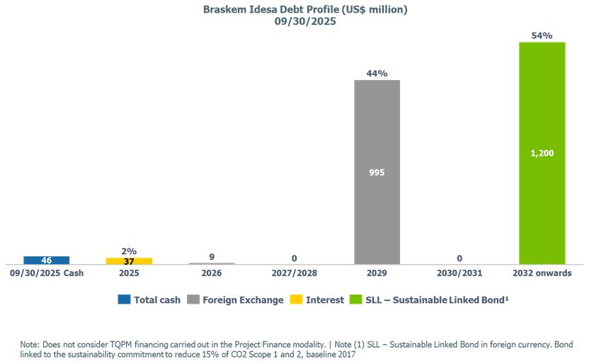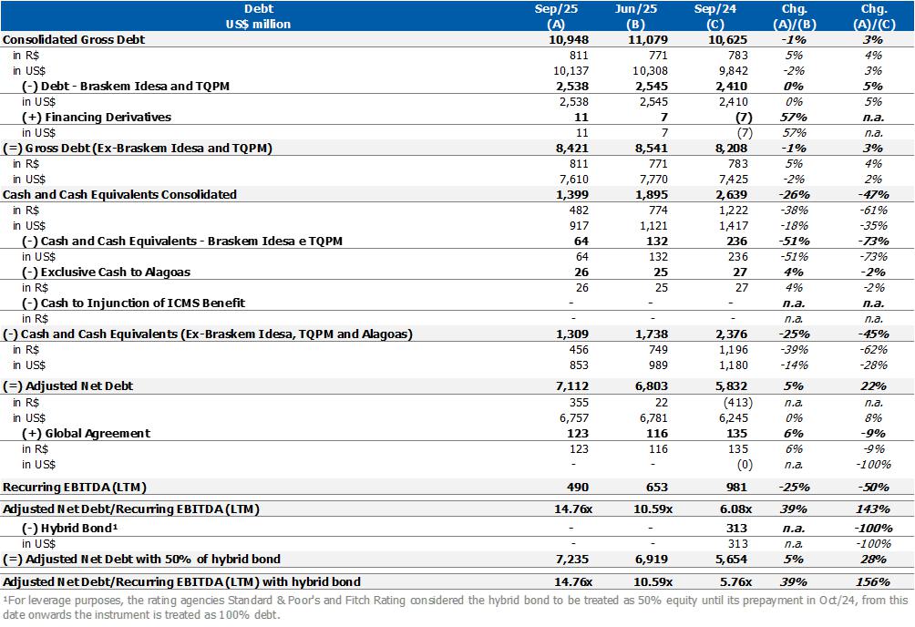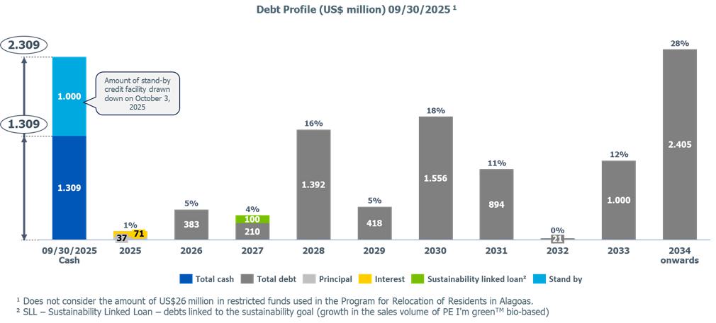 Corporate gross debt ended the quarter at approximately US$8.4 billion with an average term of 9 years. At the end of 3Q25, the cash position, excluding Braskem Idesa, was US$1.3 billion, in addition to the international revolving line in the amount of US$1 billion, which was drawn down in October 2025.