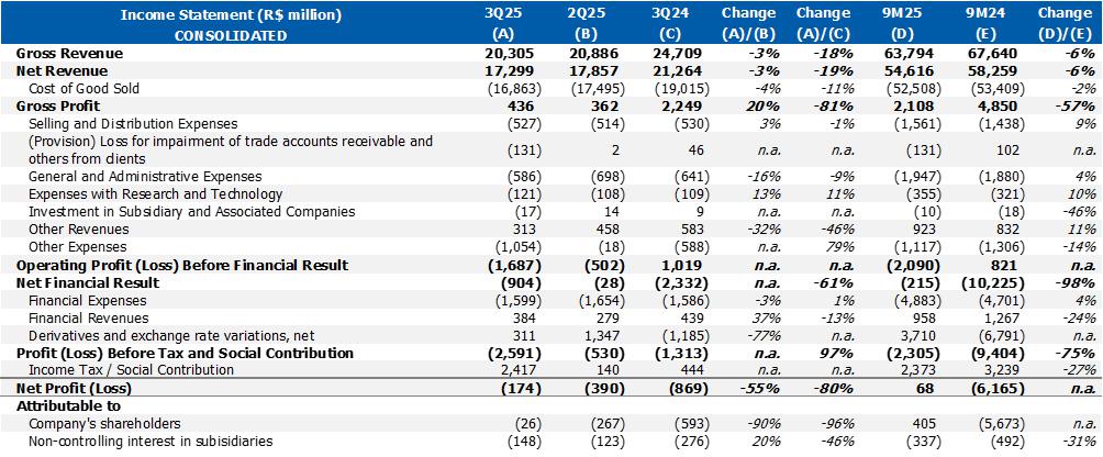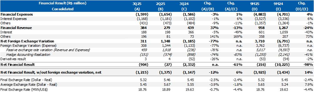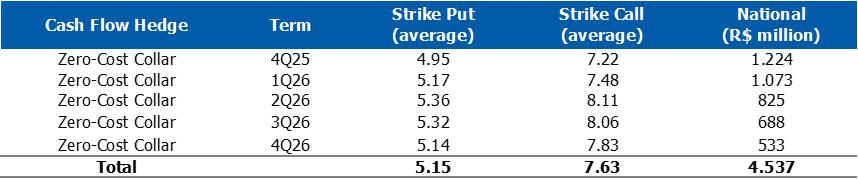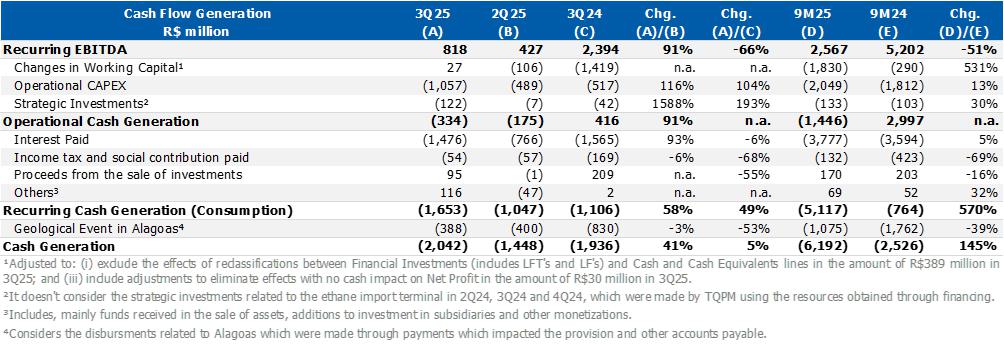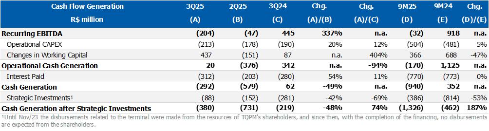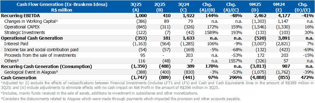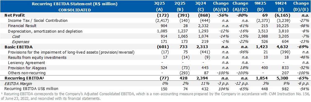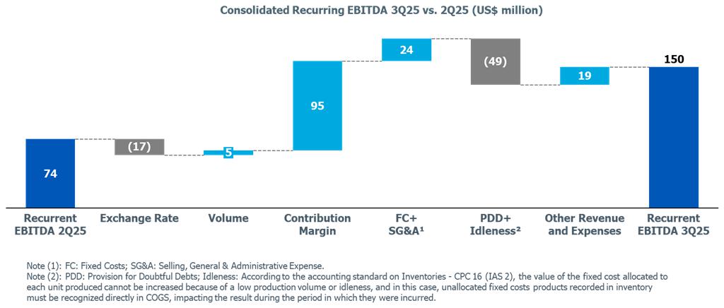 Considering the effects listed above, consolidated recurring EBITDA was US$150 million (R$818 million), 104% higher than 2Q25. Cash consumption of R$334 million, mainly influenced by higher seasonal expenses with CAPEX, partially offset by the optimization of inventory levels carried out in the quarter.