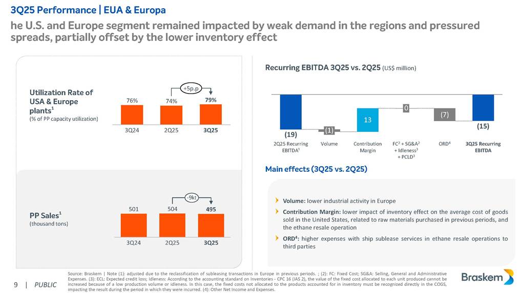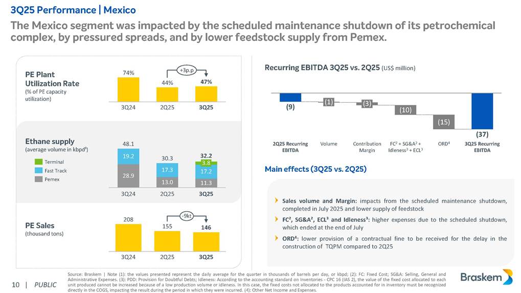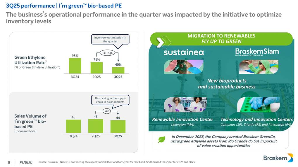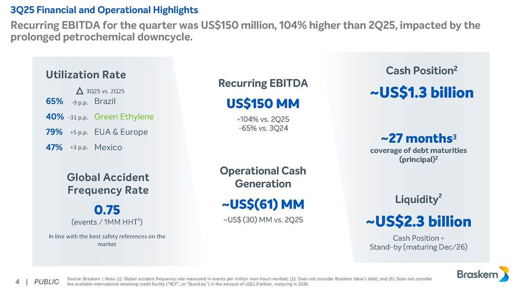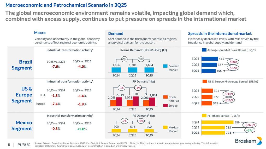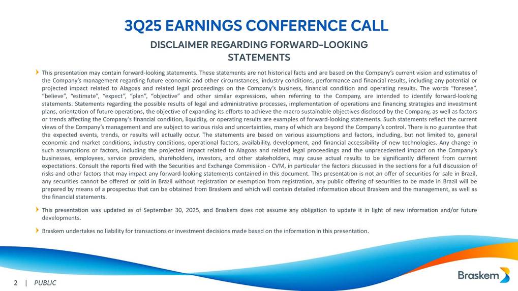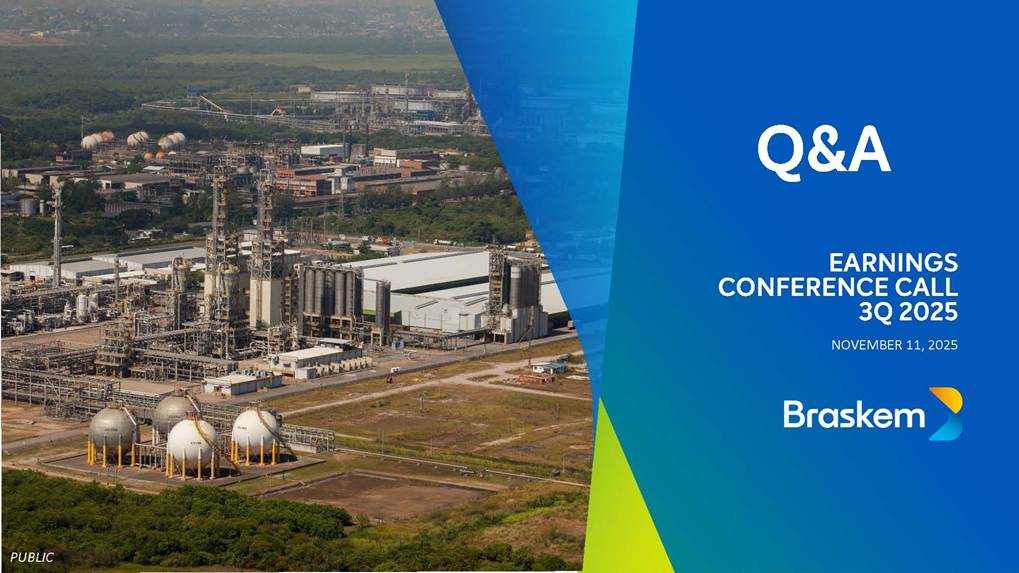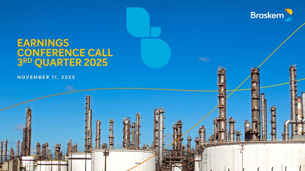 EARNINGS CONFERENCE CALL3RDQUARTER 2025 NOVEMBER 11, 2025 2 | PUBLIC Thispresentationmaycontainforward-lookingstatements.ThesestatementsarenothistoricalfactsandarebasedontheCompany’scurrentvisionandestimatesoftheCompany’smanagementregardingfutureecnomicandothercircumstances,industryconditions,performanceandfinancialresults,includinganypotentialorprojectedimpactrelatedtoAlagoasandrelatedlegalproceedingsontheCompany’sbusiness,financialconditionandoperatingresults.Thewords“foresee”,“believe”,“estimate”,“expect”,“plan”,“objective”andothersimilarexpressions,whenreferringtotheCompany,areintendedtoidentifyforward-lookingstatements.Statementsregardingthepossibleresultsoflegalandadministrativeprocesses,implementationofoperationsandfinancingstrategiesandinvestmentplans,orientationoffutureoperations,theobjectiveofexpandingitseffortstoachievethemacrosustainableobjectivesdisclosedbytheCompany,aswellasfactorsortrendsaffectingtheCompany’sfinancialcondition,liquidity,oroperatingresultsareexamplesofforward-lookingstatements.SuchstatementsreflectthecurrentviewsoftheCompany’smanagementandaresubjecttovariousrisksanduncertainties,manyofwhicharebeyondtheCompany’scontrol.Thereisnoguaranteethattheexpectedevents,trends,orresultswillactuallyoccur.Thestatementsarebasedonvariousassumptionsandfactors,including,butnotlimitedto,generaleconomicandmarketconditions,industryconditions,operationalfactors,availability,development,andfinancialaccessibilityofnewtechnologies.Anychangeinsuchassumptionsorfactors,includingtheprojectedimpactrelatedtoAlagoasandrelatedlegalproceedingsandtheunprecedentedimpactontheCompany’sbusinesses,employees,serviceproviders,shareholders,investors,andotherstakeholders,maycauseactualresultstobesignificantlydifferentfromcurrentexpectations.ConsultthereportsfiledwiththeSecuritiesandExchangeCommission-CVM,inparticularthefactorsdiscussedinthesectionsforafulldiscussionofrisksandotherfactorsthatmayimpactanyforward-lookingstatementscontainedinthisdocument.ThispresentationisnotanofferofsecuritiesforsaleinBrazil,anysecuritiescannotbeofferedorsoldinBrazilwithoutregistrationorexemptionfromregistration,anypublicofferingofsecuritiestobemadeinBrazilwillbepreparedbymeansofaprospectusthatcanbeobtainedfromBraskemandwhichwillcontaindtailedinformationaboutBraskemandthemanagement,aswellasthefinancialstatements. ThispresentationwasupdatedasofSeptember30,2025,andBraskemdoesnotassumeanyobligationtoupdateitinlightofnewinformationand/orfuturedevelopments. Braskemundertakesnoliabilityfortransactionsorinvestmentdecisionsmadebasedontheinformationinthispresentation. DISCLAIMER REGARDING FORWARD-LOOKING STATEMENTS 3Q25 EARNINGS CONFERENCE CALL 3 | PUBLIC AGENDA Financial and operational highlights Performance by segment Performance by segment Consolidated performance Consolidated performance Resilience and Transformation Program Resilience and Transformation Program Petrochemical Scenario Petrochemical Scenario 2025 Priorities and QA 2025 Priorities and Q&A 4 | 3Q25 Financial and Operational Highlights Recurring EBITDA for the quarter was US$150 million, 104% higher than 2Q25, impacted by the prolonged petrochemical downcycle. Source:Braskem|Note(1):Globalaccidentfrequencyratemeasuredineventspermillionman-hoursworked;(2):DoesnotconsiderBraskemIdesa'sdebt;and(3):Doesnotconsidertheavailableinternationalrevolvingcreditfacility(“RCF”,or“Stand-by”)intheamountofUS$1.0billion,maturingin2026. Recurring EBITDA US$150 MM +104% vs. 2Q25-65% vs. 3Q24 Cash Position2 ~US$1.3 billion Utilization Rate 65% Brazil 40% Green Ethylene 79% EUA & Europe 47% Mexico Global Accident Frequency Rate Operational Cash Generation ~US$(61) MM ~US$ (30) MM vs. 2Q25 0.75 (events / 1MM HHT¹) In line with the best safety references on the market Liquidity² ~US$2.3 billion Cash Position + Stand-by (maturing Dec/26) 3Q25 vs. 2Q25 -9 p.p. -31 p.p. +5 p.p. +3 p.p. PUBLIC ~27 months3 coverage of debt maturities (principal)2 5 | Macroeconomic and Petrochemical Scenario in 3Q25 The global macroeconomic environment remains volatile, impacting global demand which, combined with excess supply, continues to put pressure on spreads in the international market Source:ExternalConsultingFirms,Braskem,IBGE,EuroStat,U.S.CensusBureauandINEGI.|Note(1):Thisconsiderstheresinandelastomerprocessingindustry.ThisinformationconsiderspreliminaryfiguresfromSeptember.(2):Thisinformationisbasedonpreliminaryfigures. PUBLIC Macro Volatility and uncertainty in the global economy continue to affect regional economic activity. Demand Soft demand in the third quarter across all regions, an atypical pattern for the season. Spreads in the international market Historically decreased levels, with falls driven by the imbalance in global supply and demand. 3Q24 2Q25 3Q25 1,696 1,701 1,694 0% 0% 700 693 652 3Q24 2Q25 3Q25 -7% -6% 3Q24 2Q25 3Q25 2,065 2,919 2,078 3,186 2,003 2,831 -3% -4% Brazil Segment US & Europe Segment Mexico Segment 391 377 361 3Q24 2Q25 3Q25 -$30/t -$16/t US & Europe PP Average Spread(US$/t) 415 387 355 3Q24 2Q25 3Q25 -$60/t -$32/t Average spread of Brazil Resins (US$/t) 986 718 724 3Q24 2Q25 3Q25 -$263/t +$5/t PE-ethane spread(US$/t) Industrial transformation activity¹ -7.6% Europe -4.0% -1.8% -1.4% -7.4% -1.9% -0.8% +1.0% 3Q25 vs. 3Q24 3Q25 vs. 2Q25 3Q25 vs. 3Q24 3Q25 vs. 2Q25 3Q25 vs. 3Q24 3Q25 vs. 2Q25 Industrial transformation activity¹ EUA Industrial transformation activity¹ Resins Demand² (PE+PP+PVC) (kt) North America Europe PP Demand² (kt) PE Demand² (kt) BrazilianMarket Mexican Market 6 | PUBLIC AGENDA Financial and operational highlights Financial and operational highlights Performance by segment Consolidated performance Consolidated performance Resilience and Transformation Program Resilience and Transformation Program Petrochemical Scenario Petrochemical Scenario 2025 Priorities and QA 2025 Priorities and Q&A 73% 74% 65% 3Q24 2Q25 3Q25 -9p.p 152 205 58 3Q25 Recurring EBITDA (15) Exchange Rate 7 Volume Contribution Mar