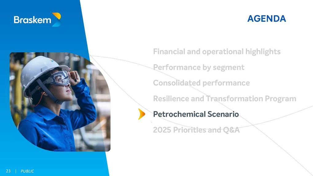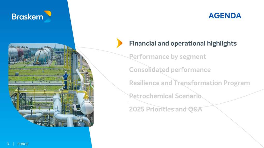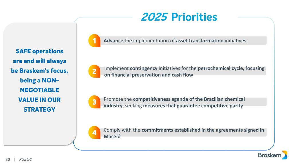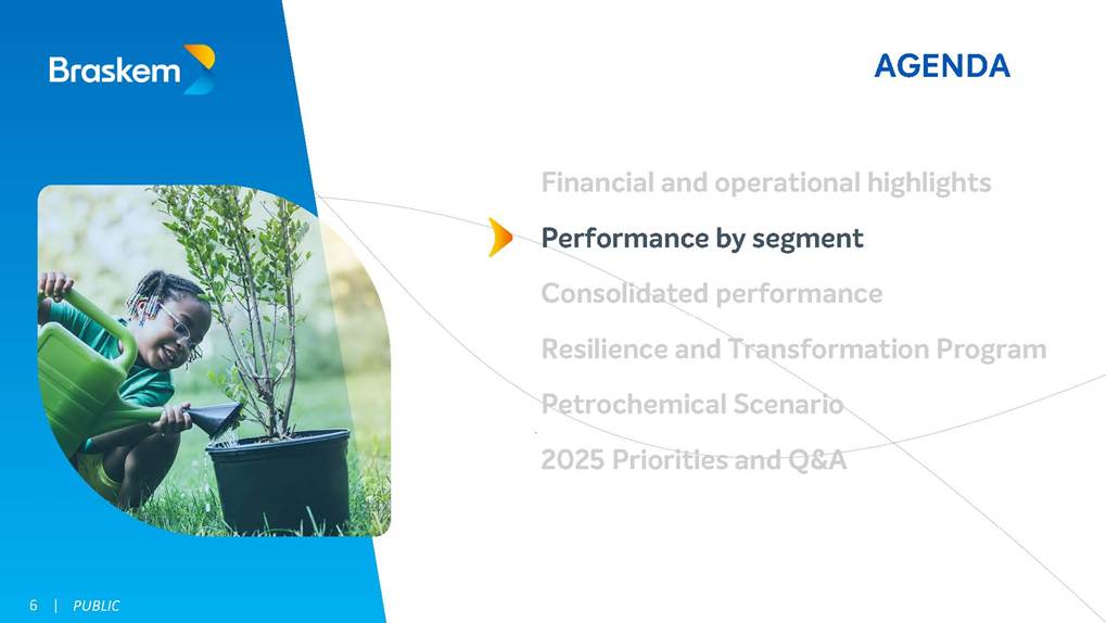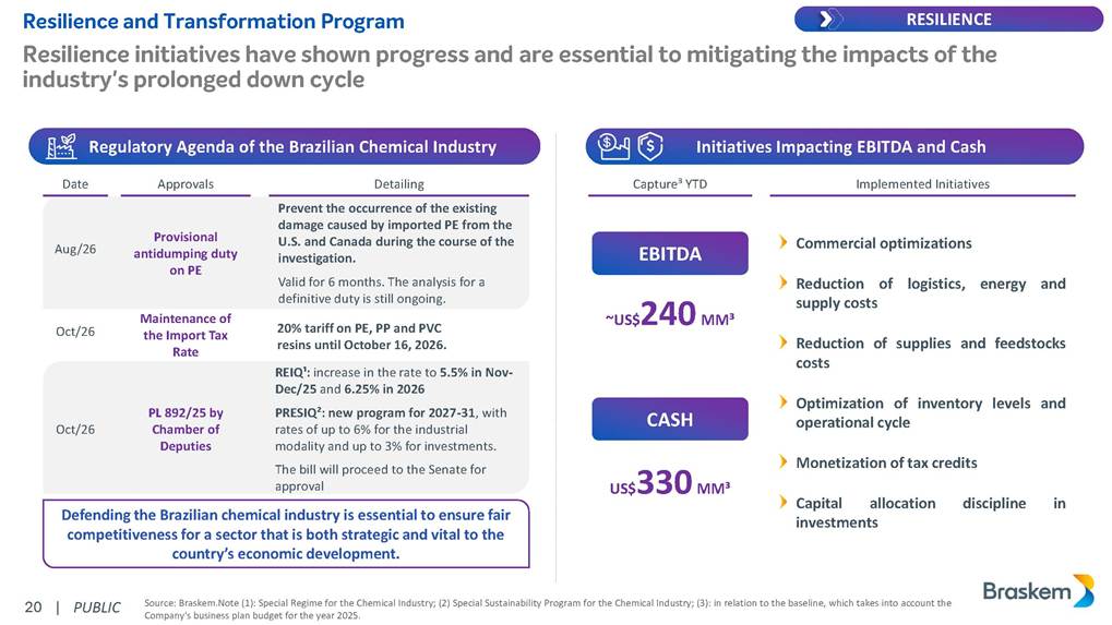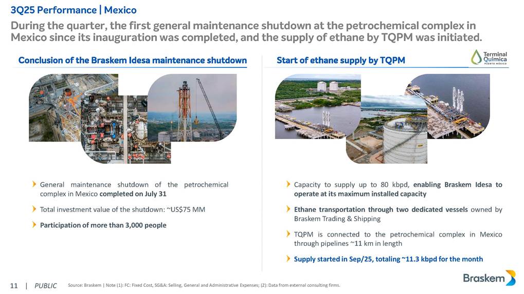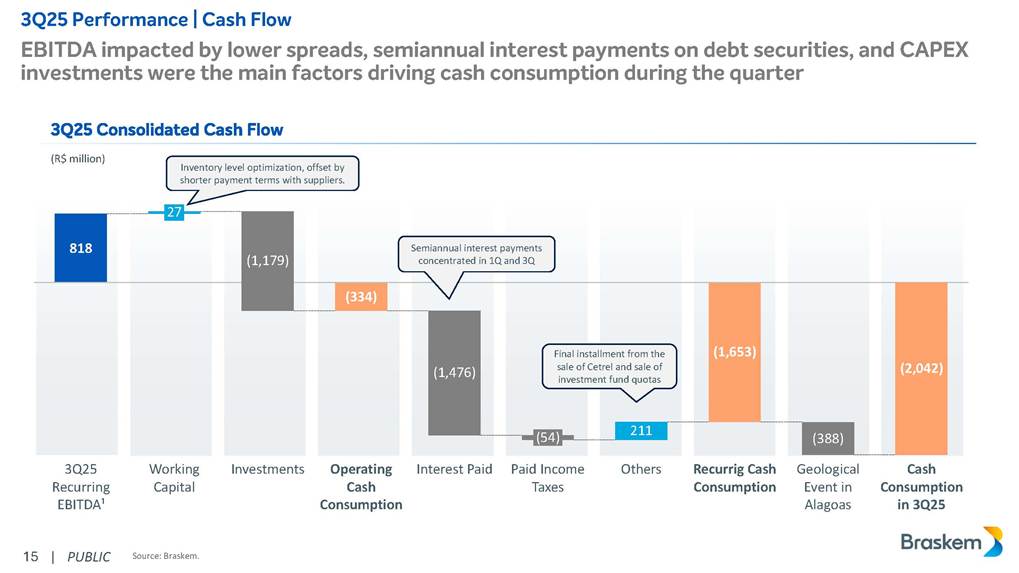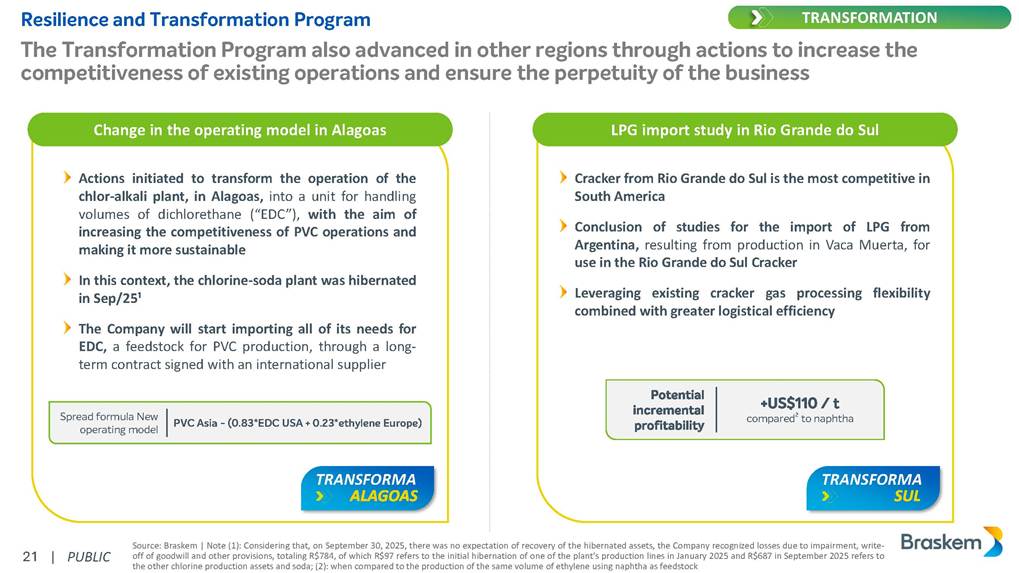 EARNINGS CONFERENCE CALL3RDQUARTER 2025 NOVEMBER 11, 2025 2 | PUBLIC Thispresentationmaycontainforward-lookingstatements.ThesestatementsarenothistoricalfactsandarebasedontheCompany’scurrentvisionandestimatesoftheCompany’smanagementregardingfutureecnomicandothercircumstances,industryconditions,performanceandfinancialresults,includinganypotentialorprojectedimpactrelatedtoAlagoasandrelatedlegalproceedingsontheCompany’sbusiness,financialconditionandoperatingresults.Thewords“foresee”,“believe”,“estimate”,“expect”,“plan”,“objective”andothersimilarexpressions,whenreferringtotheCompany,areintendedtoidentifyforward-lookingstatements.Statementsregardingthepossibleresultsoflegalandadministrativeprocesses,implementationofoperationsandfinancingstrategiesandinvestmentplans,orientationoffutureoperations,theobjectiveofexpandingitseffortstoachievethemacrosustainableobjectivesdisclosedbytheCompany,aswellasfactorsortrendsaffectingtheCompany’sfinancialcondition,liquidity,oroperatingresultsareexamplesofforward-lookingstatements.SuchstatementsreflectthecurrentviewsoftheCompany’smanagementandaresubjecttovariousrisksanduncertainties,manyofwhicharebeyondtheCompany’scontrol.Thereisnoguaranteethattheexpectedevents,trends,orresultswillactuallyoccur.Thestatementsarebasedonvariousassumptionsandfactors,including,butnotlimitedto,generaleconomicandmarketconditions,industryconditions,operationalfactors,availability,development,andfinancialaccessibilityofnewtechnologies.Anychangeinsuchassumptionsorfactors,includingtheprojectedimpactrelatedtoAlagoasandrelatedlegalproceedingsandtheunprecedentedimpactontheCompany’sbusinesses,employees,serviceproviders,shareholders,investors,andotherstakeholders,maycauseactualresultstobesignificantlydifferentfromcurrentexpectations.ConsultthereportsfiledwiththeSecuritiesandExchangeCommission-CVM,inparticularthefactorsdiscussedinthesectionsforafulldiscussionofrisksandotherfactorsthatmayimpactanyforward-lookingstatementscontainedinthisdocument.ThispresentationisnotanofferofsecuritiesforsaleinBrazil,anysecuritiescannotbeofferedorsoldinBrazilwithoutregistrationorexemptionfromregistration,anypublicofferingofsecuritiestobemadeinBrazilwillbepreparedbymeansofaprospectusthatcanbeobtainedfromBraskemandwhichwillcontaindtailedinformationaboutBraskemandthemanagement,aswellasthefinancialstatements. ThispresentationwasupdatedasofSeptember30,2025,andBraskemdoesnotassumeanyobligationtoupdateitinlightofnewinformationand/orfuturedevelopments. Braskemundertakesnoliabilityfortransactionsorinvestmentdecisionsmadebasedontheinformationinthispresentation. DISCLAIMER REGARDING FORWARD-LOOKING STATEMENTS 3Q25 EARNINGS CONFERENCE CALL 3 | PUBLIC AGENDA Financial and operational highlights Performance by segment Performance by segment Consolidated performance Consolidated performance Resilience and Transformation Program Resilience and Transformation Program Petrochemical Scenario Petrochemical Scenario 2025 Priorities and QA 2025 Priorities and Q&A 4 | 3Q25 Financial and Operational Highlights Recurring EBITDA for the quarter was US$150 million, 104% higher than 2Q25, impacted by the prolonged petrochemical downcycle. Source:Braskem|Note(1):Globalaccidentfrequencyratemeasuredineventspermillionman-hoursworked;(2):DoesnotconsiderBraskemIdesa'sdebt;and(3):Doesnotconsidertheavailableinternationalrevolvingcreditfacility(“RCF”,or“Stand-by”)intheamountofUS$1.0billion,maturingin2026. Recurring EBITDA US$150 MM +104% vs. 2Q25-65% vs. 3Q24 Cash Position2 ~US$1.3 billion Utilization Rate 65% Brazil 40% Green Ethylene 79% EUA & Europe 47% Mexico Global Accident Frequency Rate Operational Cash Generation ~US$(61) MM ~US$ (30) MM vs. 2Q25 0.75 (events / 1MM HHT¹) In line with the best safety references on the market Liquidity² ~US$2.3 billion Cash Position + Stand-by (maturing Dec/26) 3Q25 vs. 2Q25 -9 p.p. -31 p.p. +5 p.p. +3 p.p. PUBLIC ~27 months3 coverage of debt maturities (principal)2 5 | Macroeconomic and Petrochemical Scenario in 3Q25 The global macroeconomic environment remains volatile, impacting global demand which, combined with excess supply, continues to put pressure on spreads in the international market Source:ExternalConsultingFirms,Braskem,IBGE,EuroStat,U.S.CensusBureauandINEGI.|Note(1):Thisconsiderstheresinandelastomerprocessingindustry.ThisinformationconsiderspreliminaryfiguresfromSeptember.(2):Thisinformationisbasedonpreliminaryfigures. PUBLIC Macro Volatility and uncertainty in the global economy continue to affect regional economic activity. Demand Soft demand in the third quarter across all regions, an atypical pattern for the season. Spreads in the international market Historically decreased levels, with falls driven by the imbalance in global supply and demand. 3Q24 2Q25 3Q25 1,696 1,701 1,694 0% 0% 700 693 652 3Q24 2Q25 3Q25 -7% -6% 3Q24 2Q25 3Q25 2,065 2,919 2,078 3,186 2,003 2,831 -3% -4% Brazil Segment US & Europe Segment Mexico Segment 391 377 361 3Q24 2Q25 3Q25 -$30/t -$16/t US & Europe PP Average Spread(US$/t) 415 387 355 3Q24 2Q25 3Q25 -$60/t -$32/t Average spread of Brazil Resins (US$/t) 986 718 724 3Q24 2Q25 3Q25 -$263/t +$5/t PE-ethane spread(US$/t) Industrial transformation activity¹ -7.6% Europe -4.0% -1.8% -1.4% -7.4% -1.9% -0.8% +1.0% 3Q25 vs. 3Q24 3Q25 vs. 2Q25 3Q25 vs. 3Q24 3Q25 vs. 2Q25 3Q25 vs. 3Q24 3Q25 vs. 2Q25 Industrial transformation activity¹ EUA Industrial transformation activity¹ Resins Demand² (PE+PP+PVC) (kt) North America Europe PP Demand² (kt) PE Demand² (kt) BrazilianMarket Mexican Market 6 | PUBLIC AGENDA Financial and operational highlights Financial and operational highlights Performance by segment Consolidated performance Consolidated performance Resilience and Transformation Program Resilience and Transformation Program Petrochemical Scenario Petrochemical Scenario 2025 Priorities and QA 2025 Priorities and Q&A 73% 74% 65% 3Q24 2Q25 3Q25 -9p.p 152 205 58 3Q25 Recurring EBITDA (15) Exchange Rate 7 Volume Contribution Mar