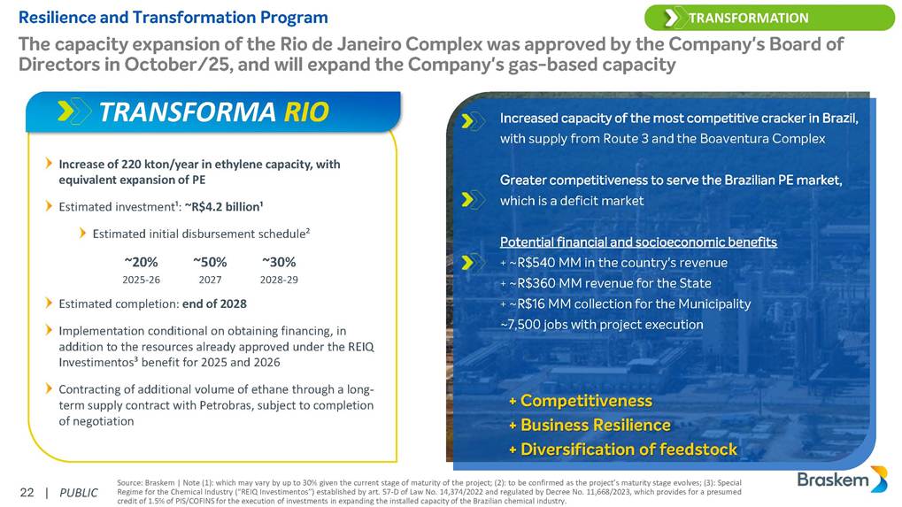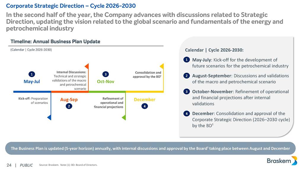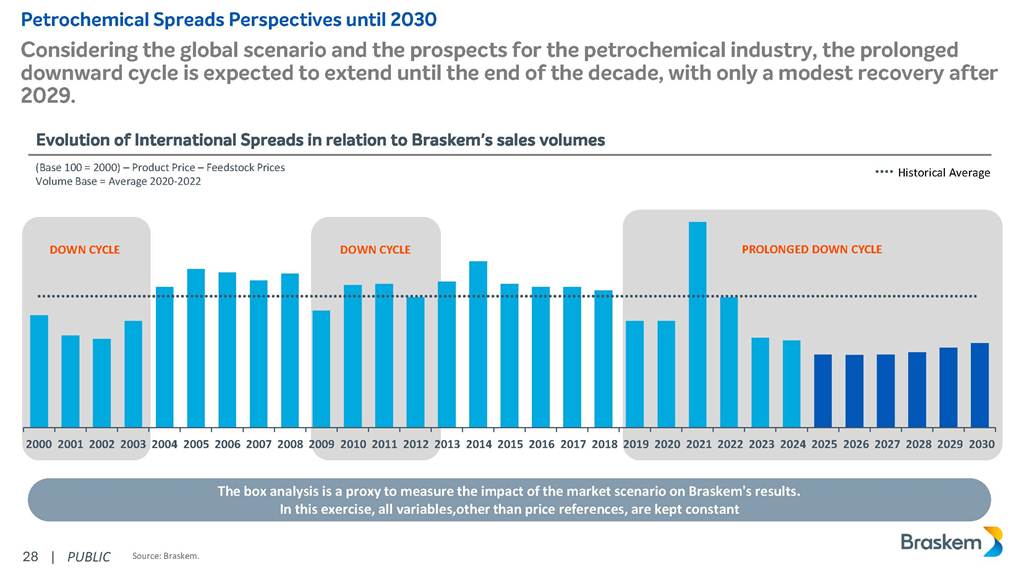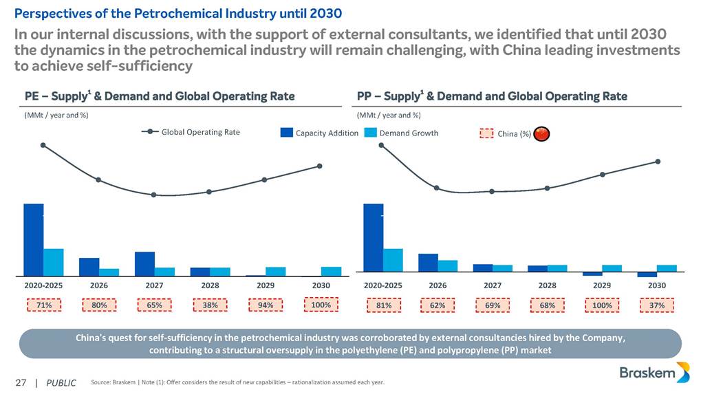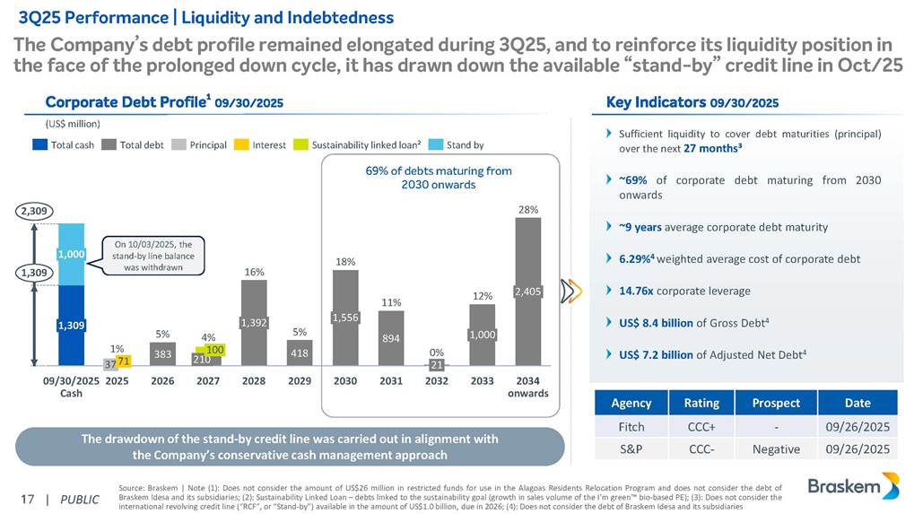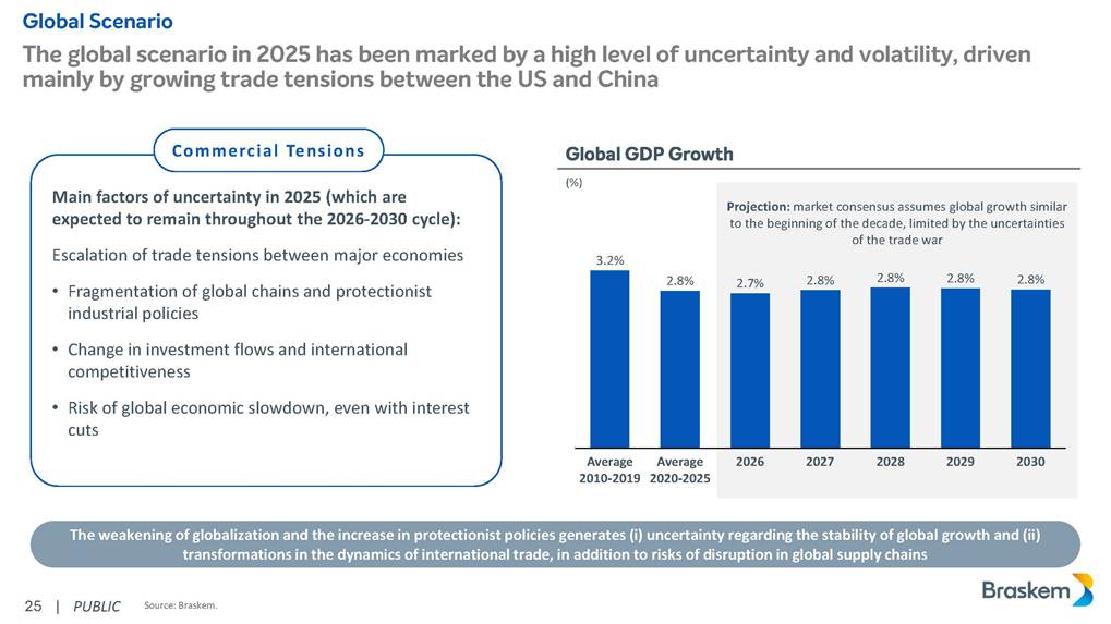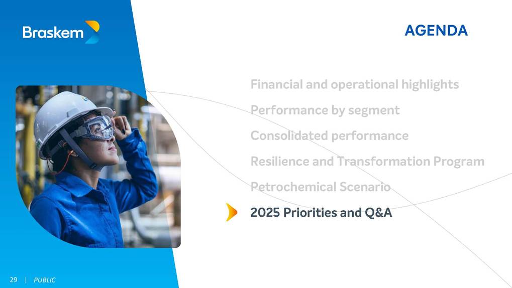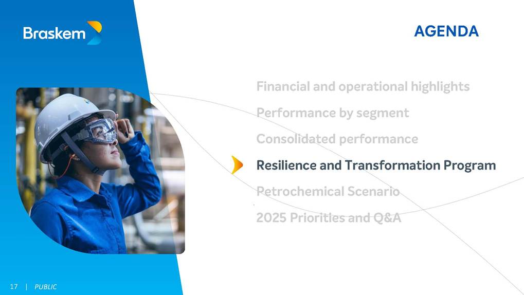 EARNINGS CONFERENCE CALL3RDQUARTER 2025 NOVEMBER 11, 2025 2 | PUBLIC Thispresentationmaycontainforward-lookingstatements.ThesestatementsarenothistoricalfactsandarebasedontheCompany’scurrentvisionandestimatesoftheCompany’smanagementregardingfutureecnomicandothercircumstances,industryconditions,performanceandfinancialresults,includinganypotentialorprojectedimpactrelatedtoAlagoasandrelatedlegalproceedingsontheCompany’sbusiness,financialconditionandoperatingresults.Thewords“foresee”,“believe”,“estimate”,“expect”,“plan”,“objective”andothersimilarexpressions,whenreferringtotheCompany,areintendedtoidentifyforward-lookingstatements.Statementsregardingthepossibleresultsoflegalandadministrativeprocesses,implementationofoperationsandfinancingstrategiesandinvestmentplans,orientationoffutureoperations,theobjectiveofexpandingitseffortstoachievethemacrosustainableobjectivesdisclosedbytheCompany,aswellasfactorsortrendsaffectingtheCompany’sfinancialcondition,liquidity,oroperatingresultsareexamplesofforward-lookingstatements.SuchstatementsreflectthecurrentviewsoftheCompany’smanagementandaresubjecttovariousrisksanduncertainties,manyofwhicharebeyondtheCompany’scontrol.Thereisnoguaranteethattheexpectedevents,trends,orresultswillactuallyoccur.Thestatementsarebasedonvariousassumptionsandfactors,including,butnotlimitedto,generaleconomicandmarketconditions,industryconditions,operationalfactors,availability,development,andfinancialaccessibilityofnewtechnologies.Anychangeinsuchassumptionsorfactors,includingtheprojectedimpactrelatedtoAlagoasandrelatedlegalproceedingsandtheunprecedentedimpactontheCompany’sbusinesses,employees,serviceproviders,shareholders,investors,andotherstakeholders,maycauseactualresultstobesignificantlydifferentfromcurrentexpectations.ConsultthereportsfiledwiththeSecuritiesandExchangeCommission-CVM,inparticularthefactorsdiscussedinthesectionsforafulldiscussionofrisksandotherfactorsthatmayimpactanyforward-lookingstatementscontainedinthisdocument.ThispresentationisnotanofferofsecuritiesforsaleinBrazil,anysecuritiescannotbeofferedorsoldinBrazilwithoutregistrationorexemptionfromregistration,anypublicofferingofsecuritiestobemadeinBrazilwillbepreparedbymeansofaprospectusthatcanbeobtainedfromBraskemandwhichwillcontaindtailedinformationaboutBraskemandthemanagement,aswellasthefinancialstatements. ThispresentationwasupdatedasofSeptember30,2025,andBraskemdoesnotassumeanyobligationtoupdateitinlightofnewinformationand/orfuturedevelopments. Braskemundertakesnoliabilityfortransactionsorinvestmentdecisionsmadebasedontheinformationinthispresentation. DISCLAIMER REGARDING FORWARD-LOOKING STATEMENTS 3Q25 EARNINGS CONFERENCE CALL 3 | PUBLIC AGENDA Financial and operational highlights Performance by segment Performance by segment Consolidated performance Consolidated performance Resilience and Transformation Program Resilience and Transformation Program Petrochemical Scenario Petrochemical Scenario 2025 Priorities and QA 2025 Priorities and Q&A 4 | 3Q25 Financial and Operational Highlights Recurring EBITDA for the quarter was US$150 million, 104% higher than 2Q25, impacted by the prolonged petrochemical downcycle. Source:Braskem|Note(1):Globalaccidentfrequencyratemeasuredineventspermillionman-hoursworked;(2):DoesnotconsiderBraskemIdesa'sdebt;and(3):Doesnotconsidertheavailableinternationalrevolvingcreditfacility(“RCF”,or“Stand-by”)intheamountofUS$1.0billion,maturingin2026. Recurring EBITDA US$150 MM +104% vs. 2Q25-65% vs. 3Q24 Cash Position2 ~US$1.3 billion Utilization Rate 65% Brazil 40% Green Ethylene 79% EUA & Europe 47% Mexico Global Accident Frequency Rate Operational Cash Generation ~US$(61) MM ~US$ (30) MM vs. 2Q25 0.75 (events / 1MM HHT¹) In line with the best safety references on the market Liquidity² ~US$2.3 billion Cash Position + Stand-by (maturing Dec/26) 3Q25 vs. 2Q25 -9 p.p. -31 p.p. +5 p.p. +3 p.p. PUBLIC ~27 months3 coverage of debt maturities (principal)2 5 | Macroeconomic and Petrochemical Scenario in 3Q25 The global macroeconomic environment remains volatile, impacting global demand which, combined with excess supply, continues to put pressure on spreads in the international market Source:ExternalConsultingFirms,Braskem,IBGE,EuroStat,U.S.CensusBureauandINEGI.|Note(1):Thisconsiderstheresinandelastomerprocessingindustry.ThisinformationconsiderspreliminaryfiguresfromSeptember.(2):Thisinformationisbasedonpreliminaryfigures. PUBLIC Macro Volatility and uncertainty in the global economy continue to affect regional economic activity. Demand Soft demand in the third quarter across all regions, an atypical pattern for the season. Spreads in the international market Historically decreased levels, with falls driven by the imbalance in global supply and demand. 3Q24 2Q25 3Q25 1,696 1,701 1,694 0% 0% 700 693 652 3Q24 2Q25 3Q25 -7% -6% 3Q24 2Q25 3Q25 2,065 2,919 2,078 3,186 2,003 2,831 -3% -4% Brazil Segment US & Europe Segment Mexico Segment 391 377 361 3Q24 2Q25 3Q25 -$30/t -$16/t US & Europe PP Average Spread(US$/t) 415 387 355 3Q24 2Q25 3Q25 -$60/t -$32/t Average spread of Brazil Resins (US$/t) 986 718 724 3Q24 2Q25 3Q25 -$263/t +$5/t PE-ethane spread(US$/t) Industrial transformation activity¹ -7.6% Europe -4.0% -1.8% -1.4% -7.4% -1.9% -0.8% +1.0% 3Q25 vs. 3Q24 3Q25 vs. 2Q25 3Q25 vs. 3Q24 3Q25 vs. 2Q25 3Q25 vs. 3Q24 3Q25 vs. 2Q25 Industrial transformation activity¹ EUA Industrial transformation activity¹ Resins Demand² (PE+PP+PVC) (kt) North America Europe PP Demand² (kt) PE Demand² (kt) BrazilianMarket Mexican Market 6 | PUBLIC AGENDA Financial and operational highlights Financial and operational highlights Performance by segment Consolidated performance Consolidated performance Resilience and Transformation Program Resilience and Transformation Program Petrochemical Scenario Petrochemical Scenario 2025 Priorities and QA 2025 Priorities and Q&A 73% 74% 65% 3Q24 2Q25 3Q25 -9p.p 152 205 58 3Q25 Recurring EBITDA (15) Exchange Rate 7 Volume Contribution Mar