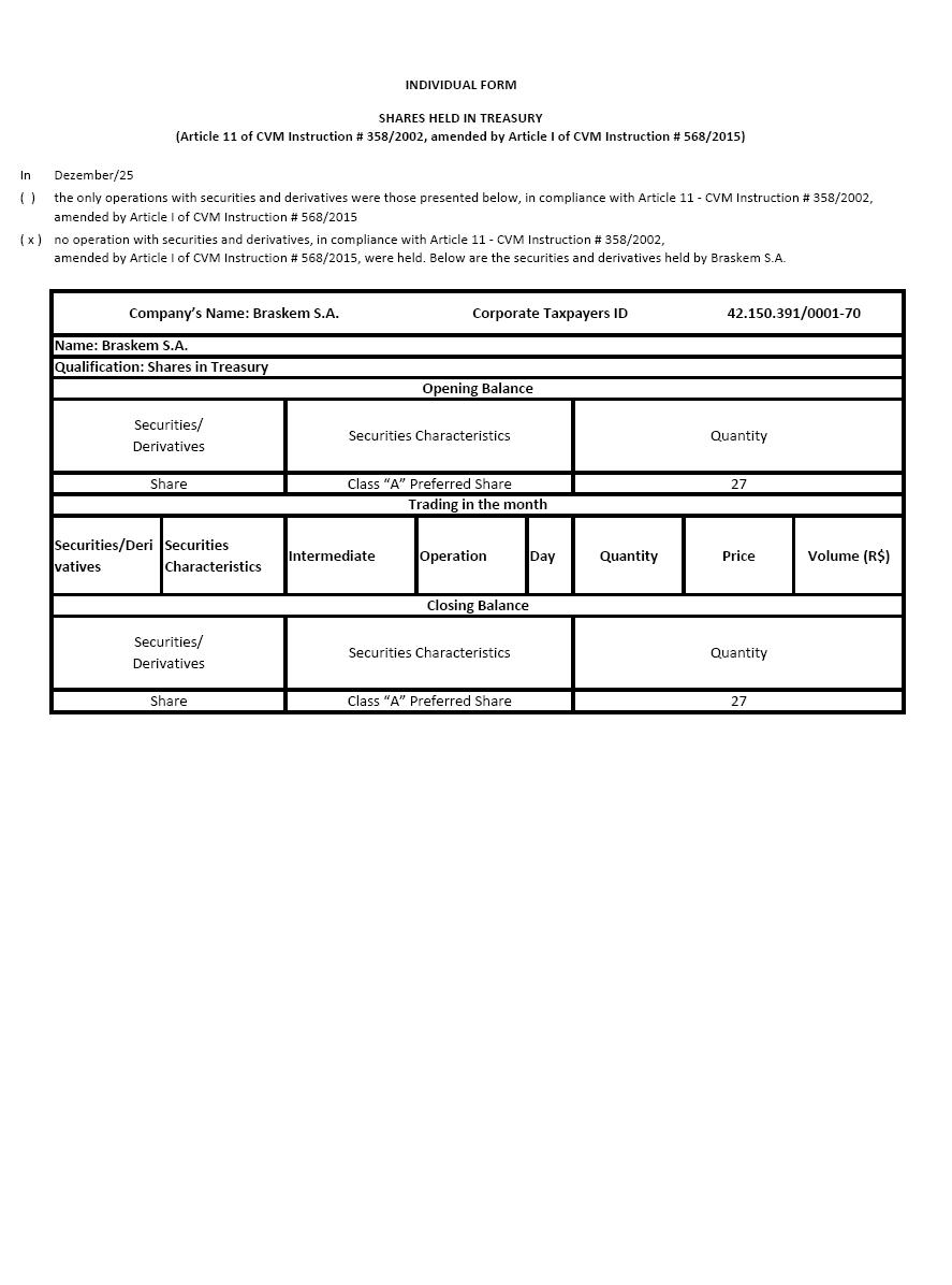 In Dezember/25 ( ) ( x ) Securities/Derivatives Securities Characteristics Intermediate Operation Day Quantity Price Volume (R$) 27 Quantity Quantity Qualification: Shares in Treasury Share Class “A” Preferred Share Closing Balance Securities/Derivatives Securities Characteristics Trading in the month 27 Securities/Derivatives Securities Characteristics Share Class “A” Preferred Share INDIVIDUAL FORM SHARES HELD IN TREASURY(Article 11 of CVM Instruction # 358/2002, amended by Article I of CVM Instruction # 568/2015) the only operations with securities and derivatives were those presented below, in compliance with Article 11 - CVM Instruction # 358/2002, amended by Article I of CVM Instruction # 568/2015 no operation with securities and derivatives, in compliance with Article 11 - CVM Instruction # 358/2002, Opening Balance 42.150.391/0001-70 Corporate Taxpayers ID Company’s Name: Braskem S.A. amended by Article I of CVM Instruction # 568/2015, were held. Below are the securities and derivatives held by Braskem S.A. Name: Braskem S.A.