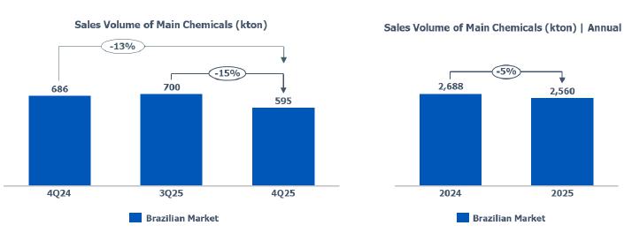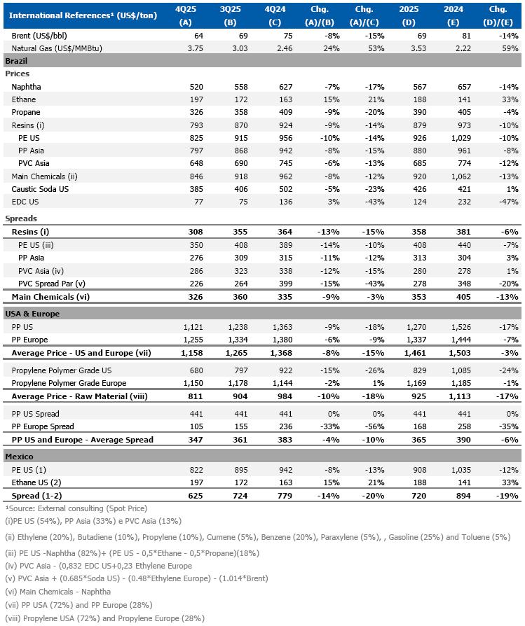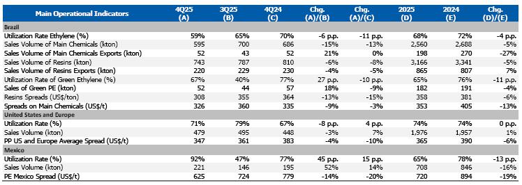 In the Brazil/South America segment, international market reference prices for resins and chemicals in 4Q25 were lower compared to the previous quarter, driven by the continued imbalance between global supply and demand. In this context, despite prioritizing higher value-added sales, the utilization rate of petrochemical complexes was lower than in 3Q25, mainly due to the scheduled maintenance shutdown at the Bahia petrochemical Complex.