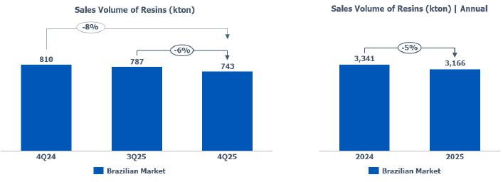 Compared to 2024, resin sales volumes in 2025 were lower (-5%), mainly explained by the decrease in PP (-8%), PVC (-7%), and PE (-3%) sales volumes, primarily due to: (i) the strategy to prioritize higher value-added sales; and (ii) lower PP and PE sales volumes due to a 3% reduction in the Brazilian market demand.