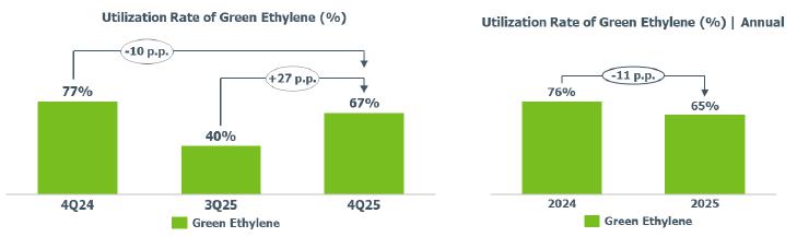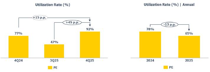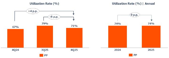 Compared to 4Q24, the average utilization rate of the PE plants was higher (+15 p.p.), mainly due to the higher supply of imported ethane in 4Q25.