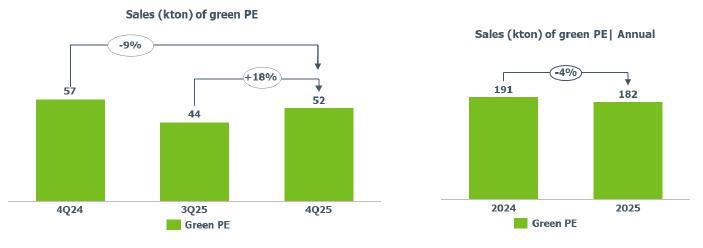 Green PE (I’m greenTM biobased) sales volume: higher compared to 3Q25 (+18%), mainly explained by higher demand for Green PE in Asia in anticipation of the Chinese New Year period.