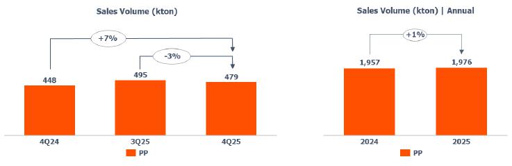 PP sales volume: lower compared to 3Q25 (-3%), mainly explained by the seasonality of the period.