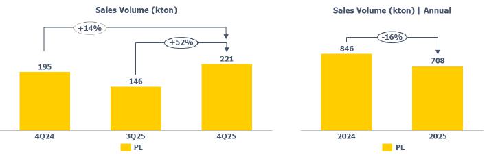 PE sales volume: higher compared to 3Q25 (+52%) and 4Q24 (+14%), mainly explained by the higher product availability for sale due to the higher utilization rate in 4Q25, as previously explained.
