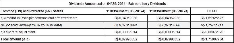It is important to notice that the gross dividend values per share will continue to be adjusted by the Selic rate from December 31, 2023, until their respective payment dates. According to Petrobras' shareholders remuneration policy, extraordinary dividends are considered regular dividends, not special dividends.