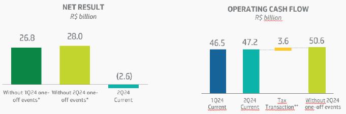 “Petrobras maintained robust cash generation in the second quarter of 2024, which allowed it to make US$ 3 billion in investments, comply with our shareholder remuneration policy and pay dividends.  The net result for the quarter should be analyzed in light of events that impacted the accounting result but had no relevant impact on the company's cash flow. The main events were the exchange rate variation for the period - an effect between companies in the Petrobras System that has no cash effect or even equity effect - and the impact of adhering to the tax transaction - a decision deemed positive by the market because it ended billion-dollar disputes that brought great uncertainty to the company's cash flow. Without these events, net income for 2Q24 would have reached US$ 5.4 billion and EBITDA would have been US$ 12 billion, in line with the previous quarter”. Fernando Melgarejo, Chief Financial and Investor Relations Officer